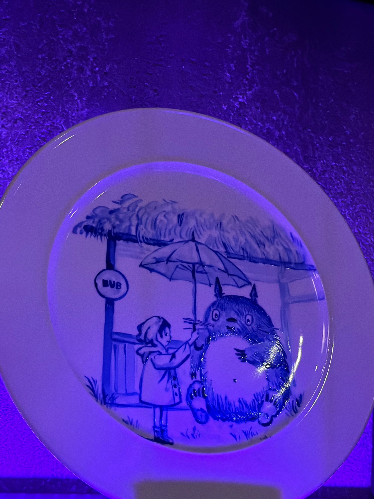 A white plate with a blue illustration is placed on a textured, purple background. The illustration depicts a character reminiscent of Totoro, holding an umbrella, alongside a small child standing atβ¦read more