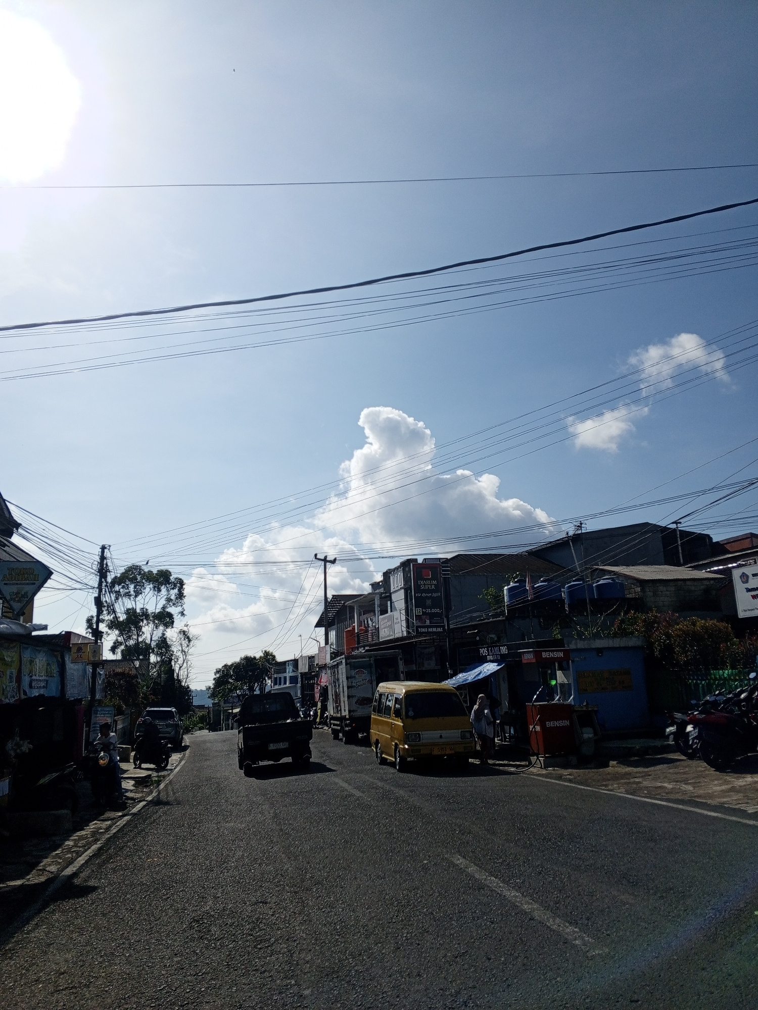 The image shows a street scene in a city, likely a small town. The road is asphalt, with a lane dividing line visible. Several vehicles are present: motorcycles parked on the sidewalk, a dark-colored…read more