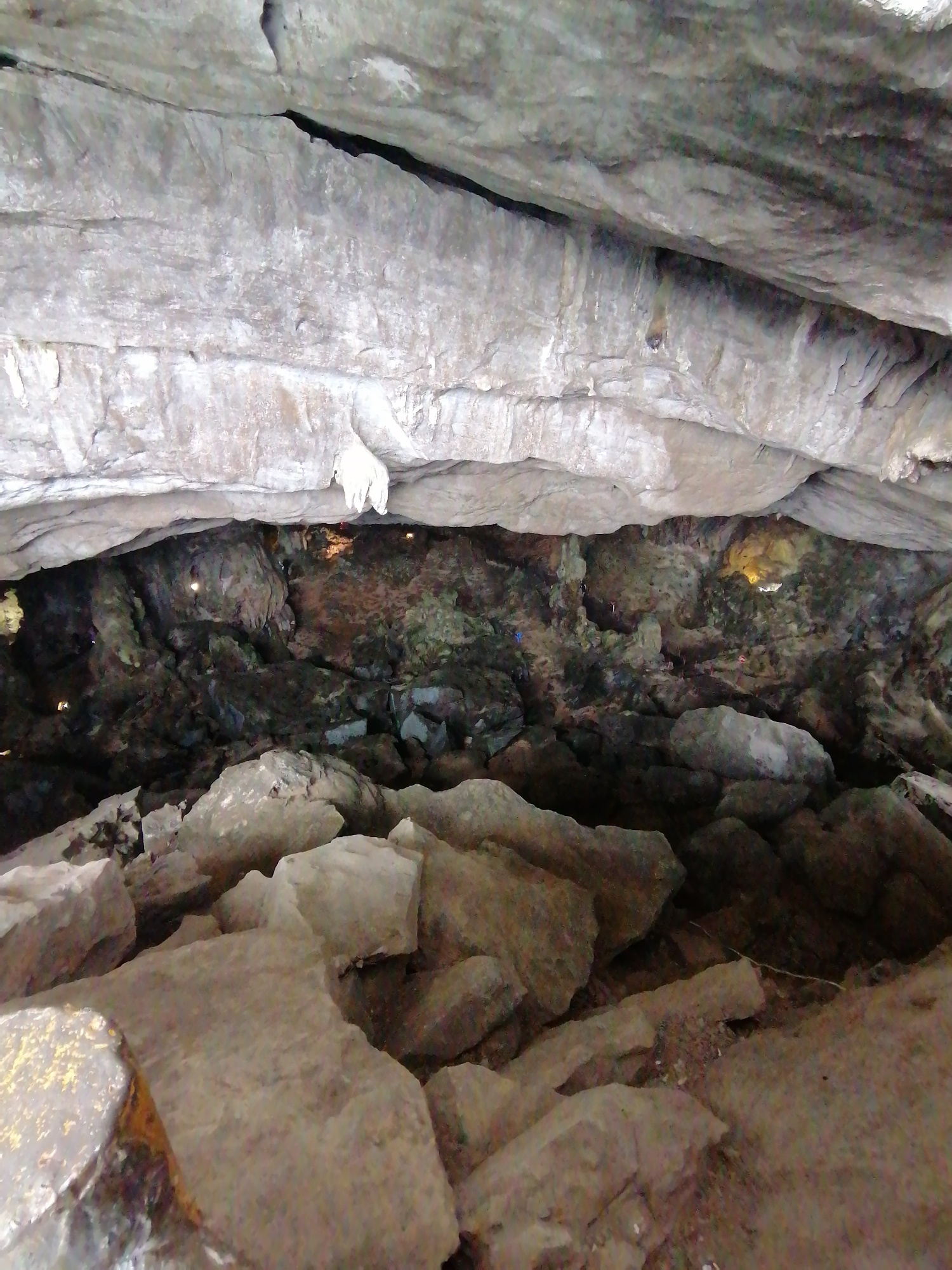 The image presents a view from within a natural cave or a large rock overhang, characterized by massive, textured rock formations. The foreground and mid-ground are dominated by a low, sprawling cave…read more