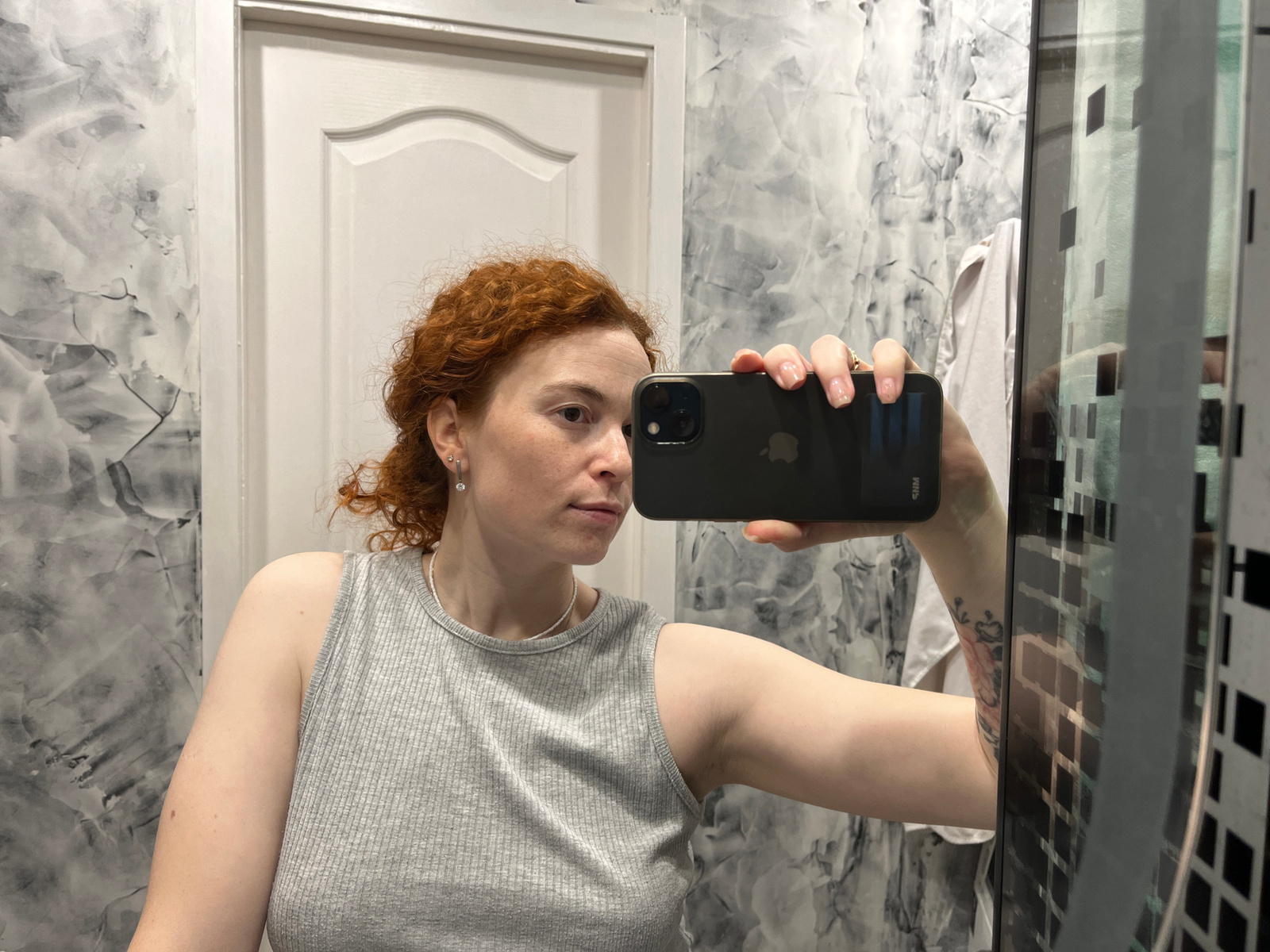 A woman with red, curly hair takes a mirror selfie indoors, holding a dark-colored smartphone with a visible Apple logo in her right hand. She is looking slightly to her right with a neutral expressio…read more
