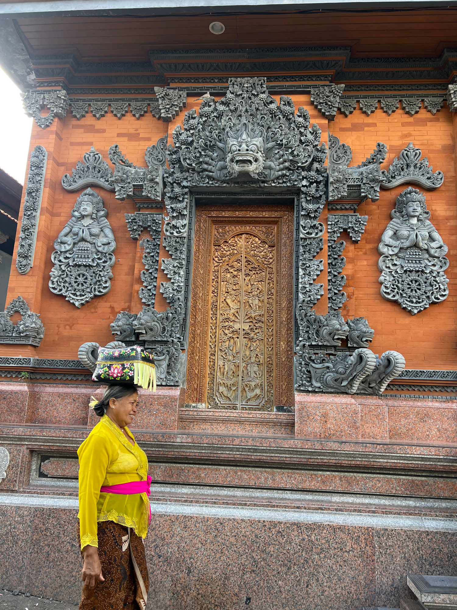A woman in traditional Balinese clothing stands in front of a highly decorated Balinese temple doorway in Singakerta, Indonesia. The doorway features intricate carvings in brick and stone, including f…read more