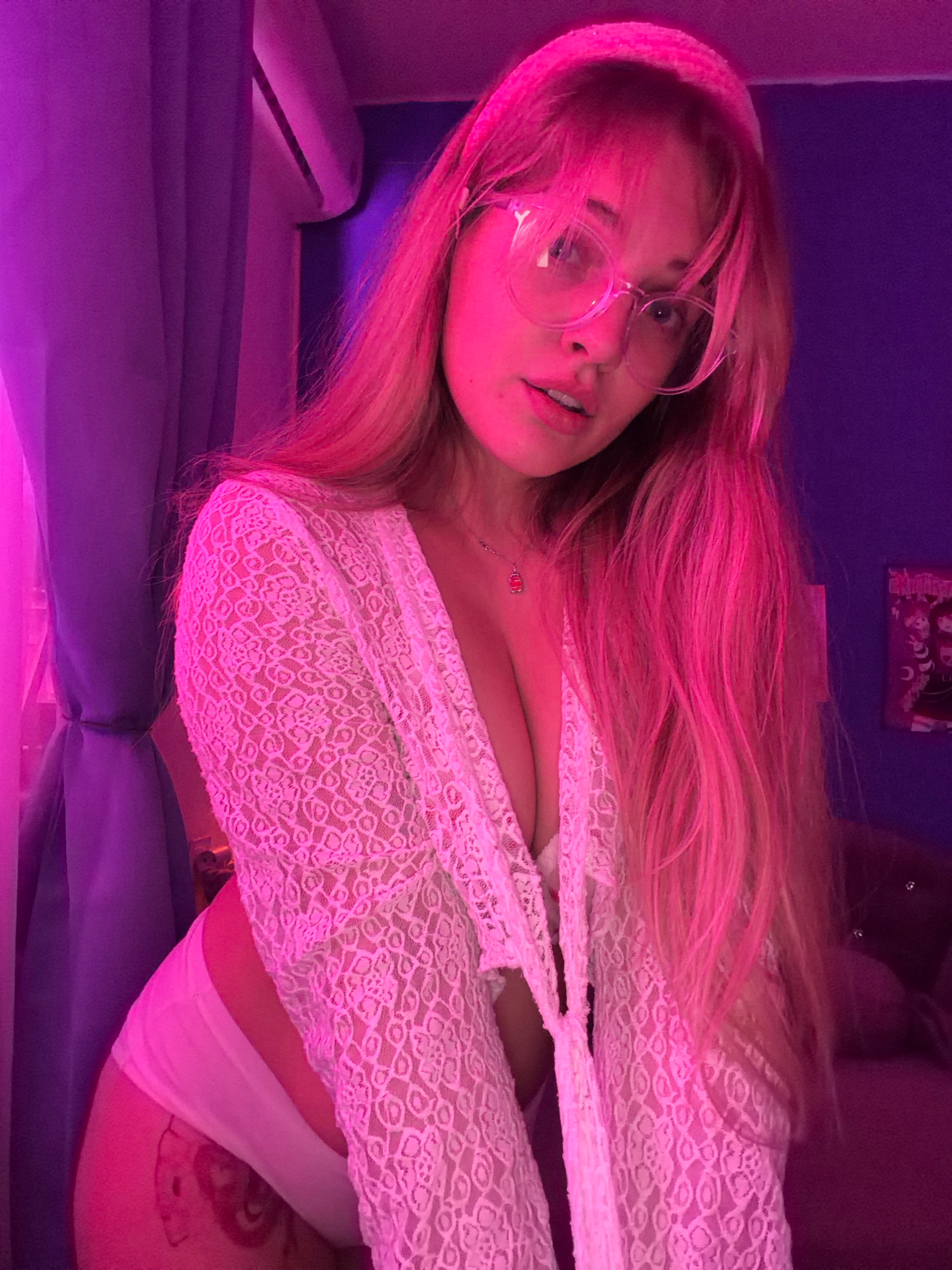 A young woman with long pink hair and eyeglasses is depicted in a selfie-style image. She is wearing a white lace top and white underwear. A floral tattoo is visible on her thigh. The environment appe…read more