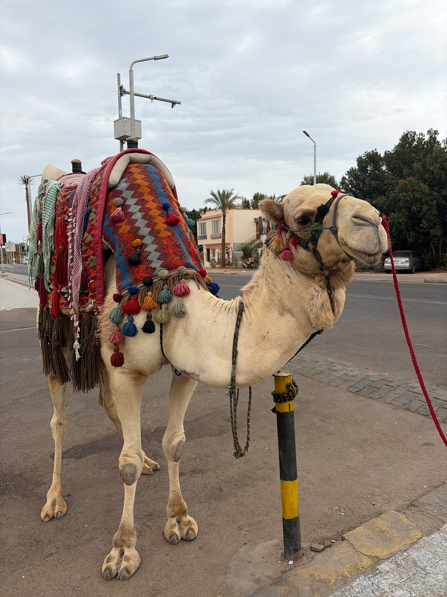 A camel stands on a paved street next to a yellow and black pole in Sharm El Sheikh, Egypt. The camel is adorned with a colorful, patterned blanket decorated with tassels. It is tethered to the pole w…read more
