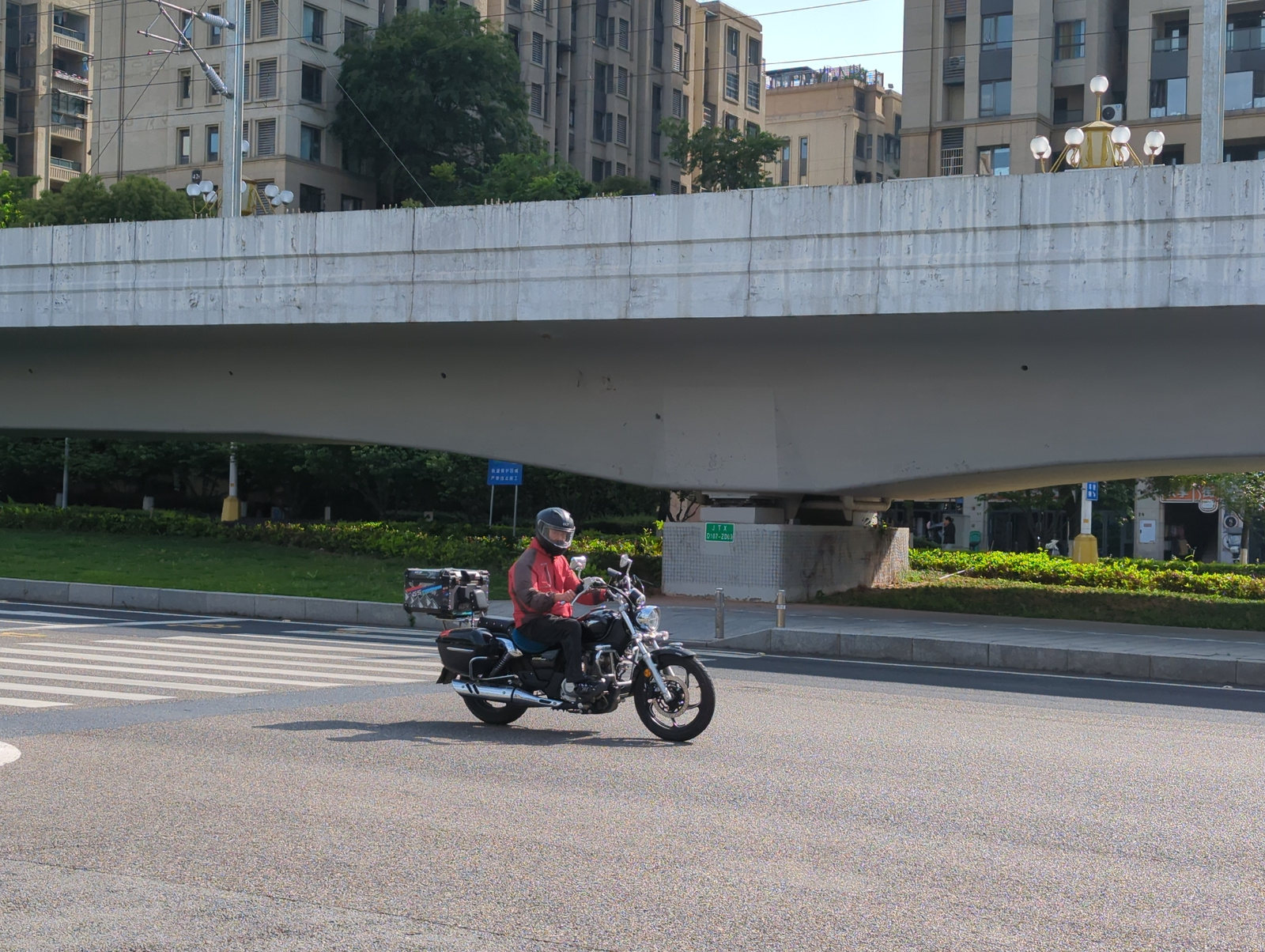This image depicts an urban street scene in Jiangjin, China, featuring a motorcyclist under a large concrete overpass on a bright, clear day. The central subject is an individual riding a black cruis…read more
