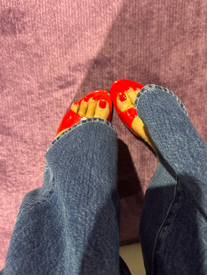An overhead image displays the lower legs and feet of an individual. The person is wearing blue denim jeans, which are slightly folded or gathered around the ankles. Both feet are clad in bright red,…read more