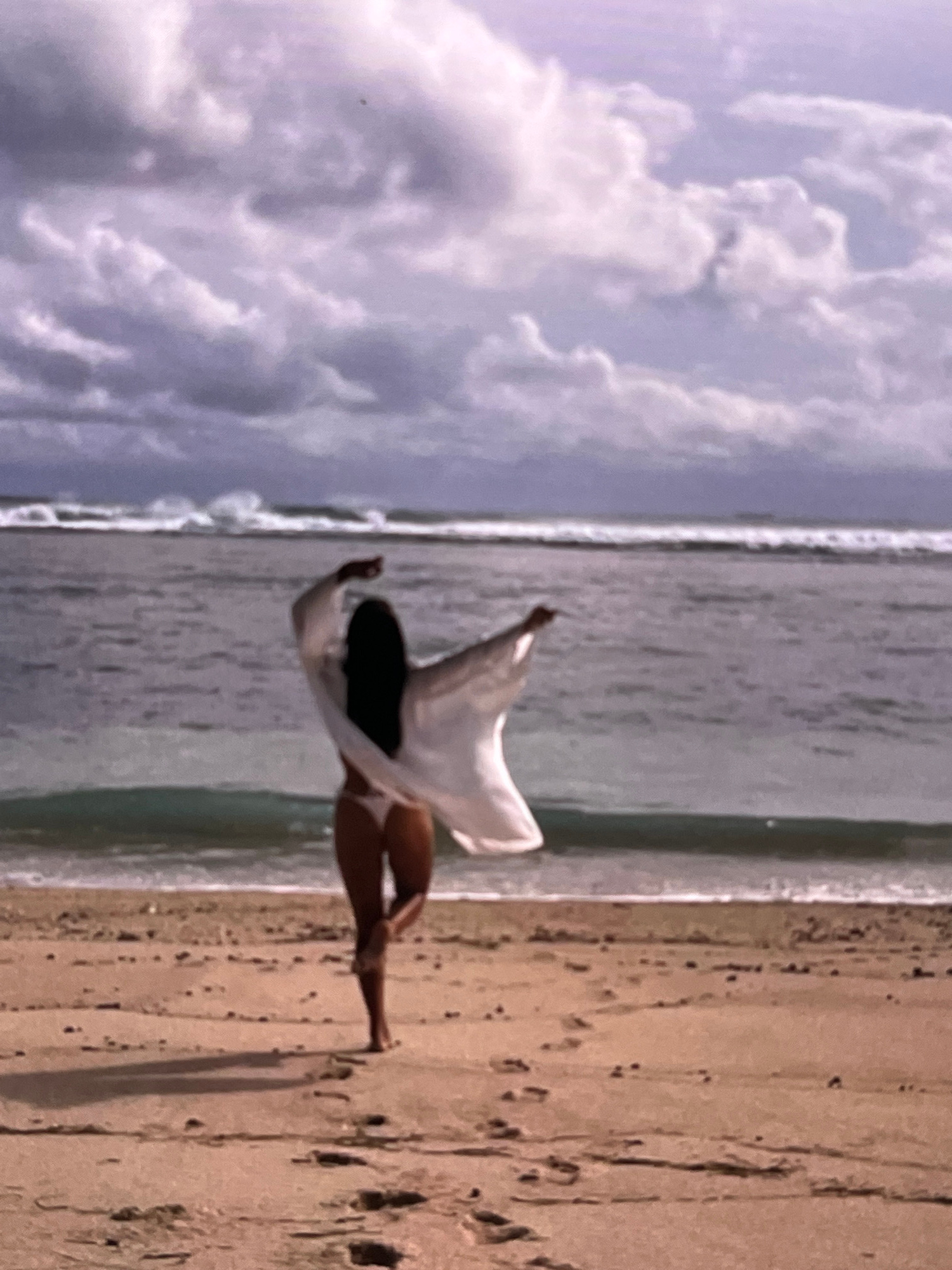 A woman lying on a surfboard on a beach in Unknown, Indonesia. The woman is wearing a white cover-up and a bikini. The beach is sandy and there are clouds in the sky. The ocean is in the background.