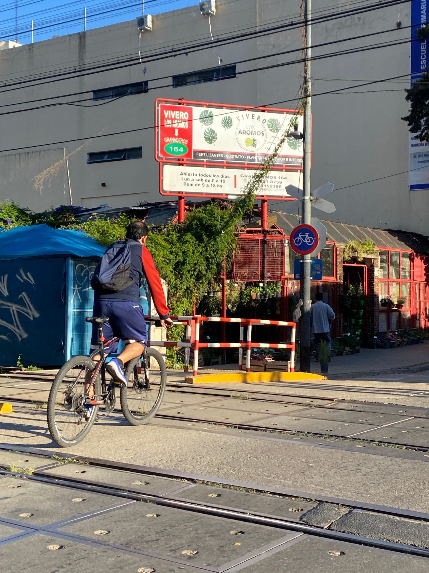 The image shows a man on a bicycle crossing railroad tracks in front of "Vivero Los Aromos" (a plant nursery) at Granaderos 164 in Buenos Aires, Argentina. The nursery's sign is prominently displayed,…read more