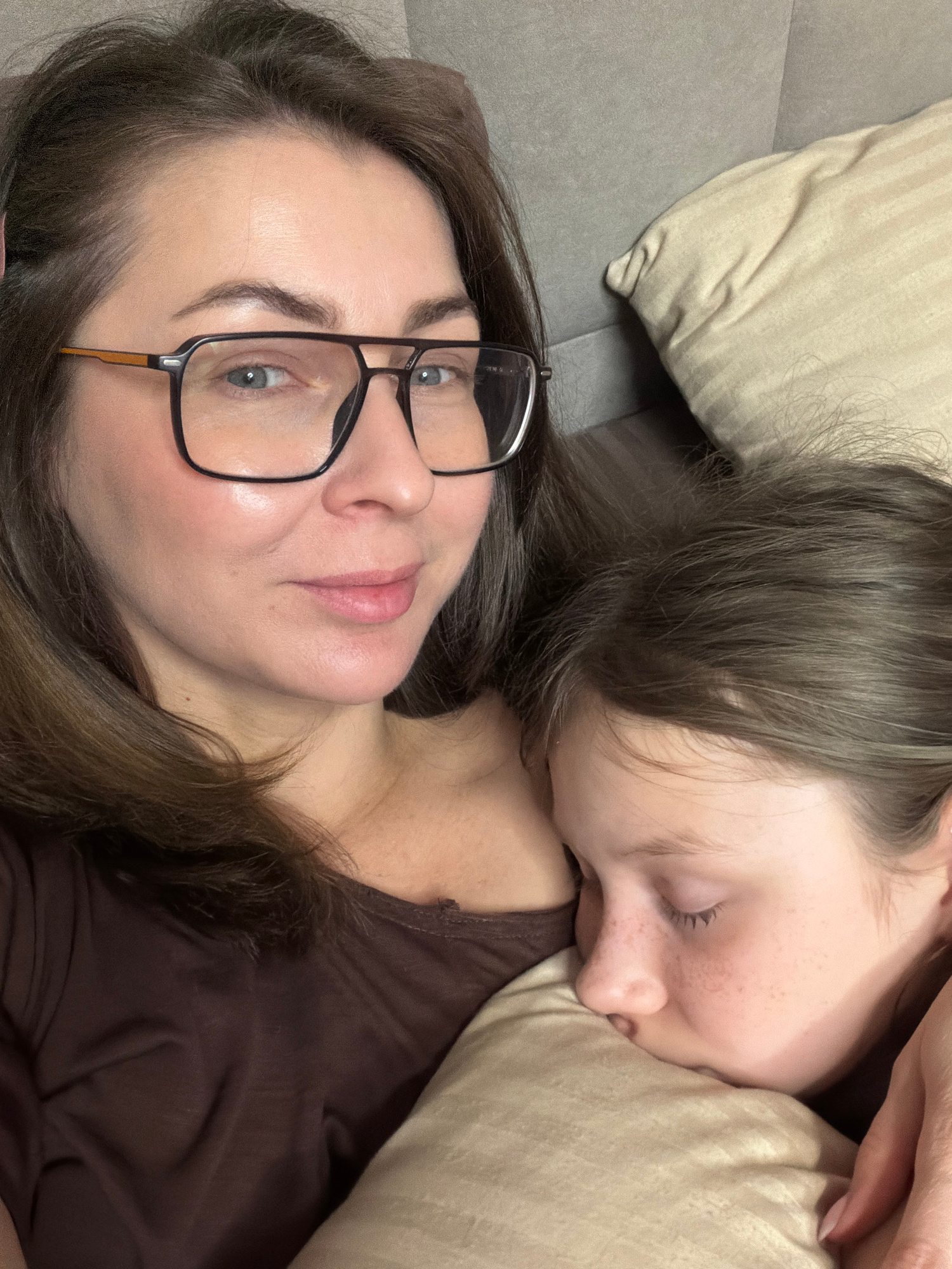 A woman wearing glasses is lying on a sofa with a child who is sleeping on her chest. A tan pillow is positioned behind the child's head. The woman is facing the camera with her eyes open. The locatio…read more
