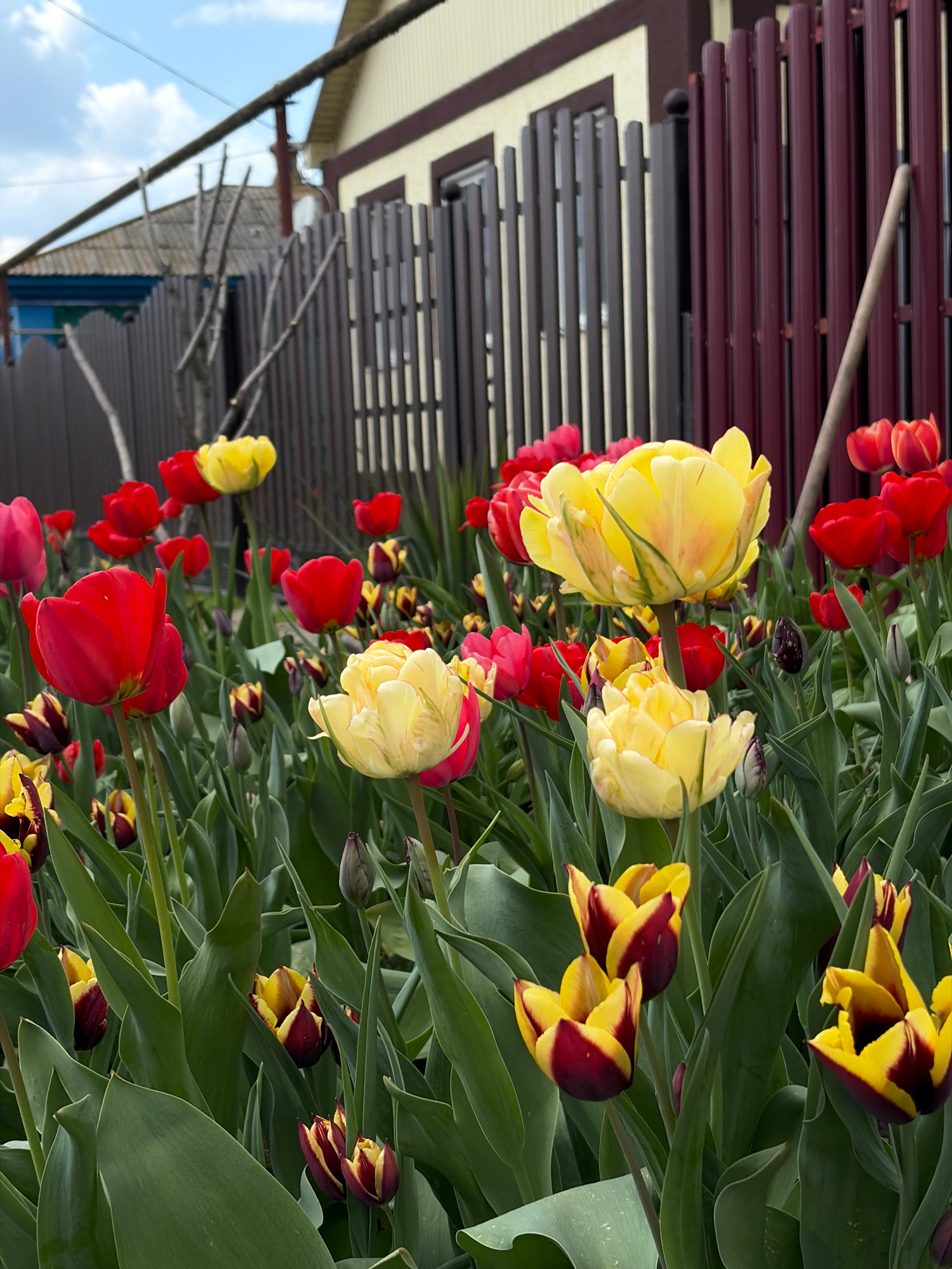 The image captures a vibrant display of numerous tulips in full bloom, likely within a garden or flower bed. The perspective looks slightly down upon the flowers, with architectural elements and the s…read more