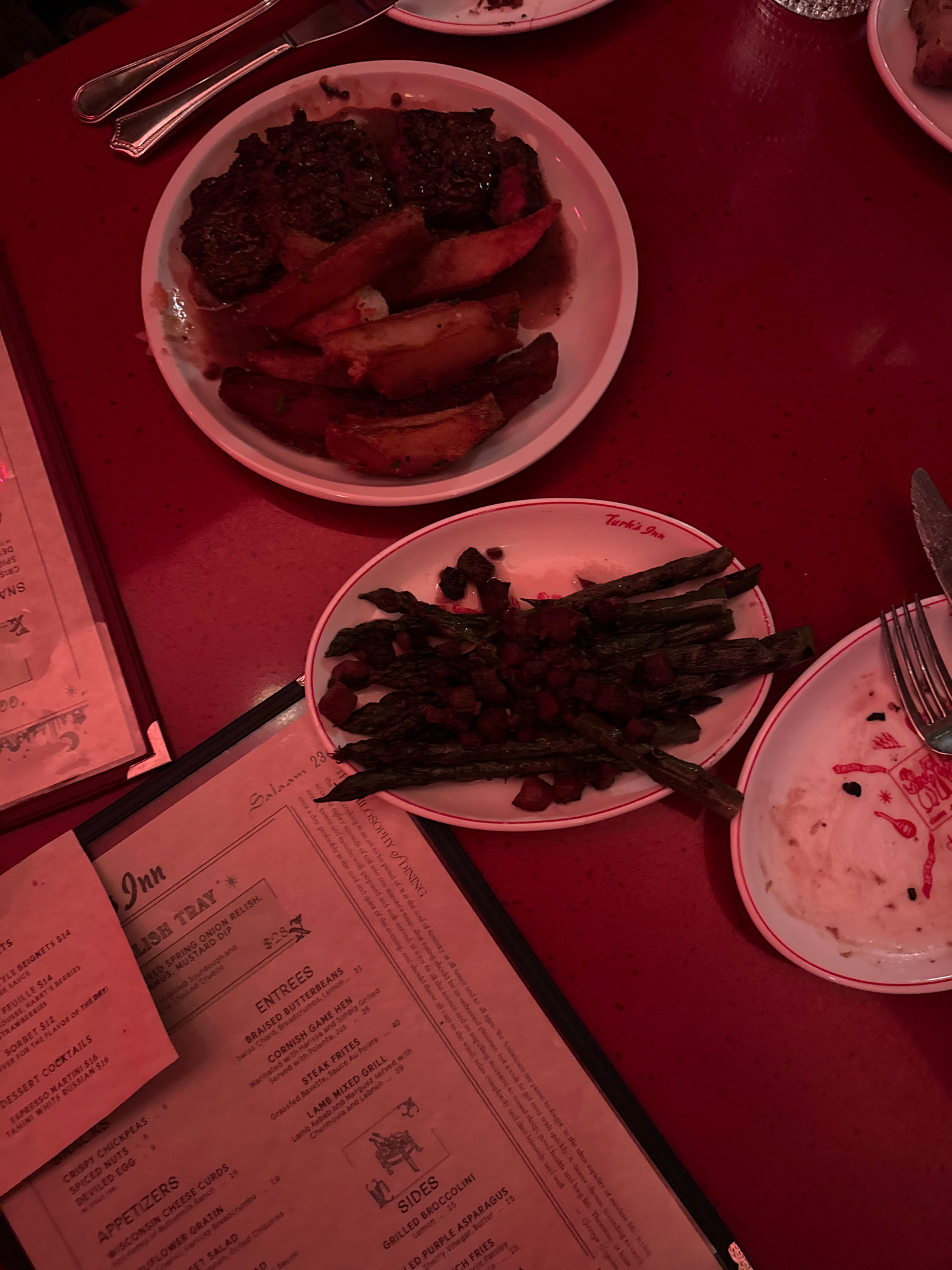 The image depicts a table setting with plates of food and menus at Turk's Inn, a restaurant in New York City, United States of America. From a high angle view, the food includes asparagus with what ap…read more