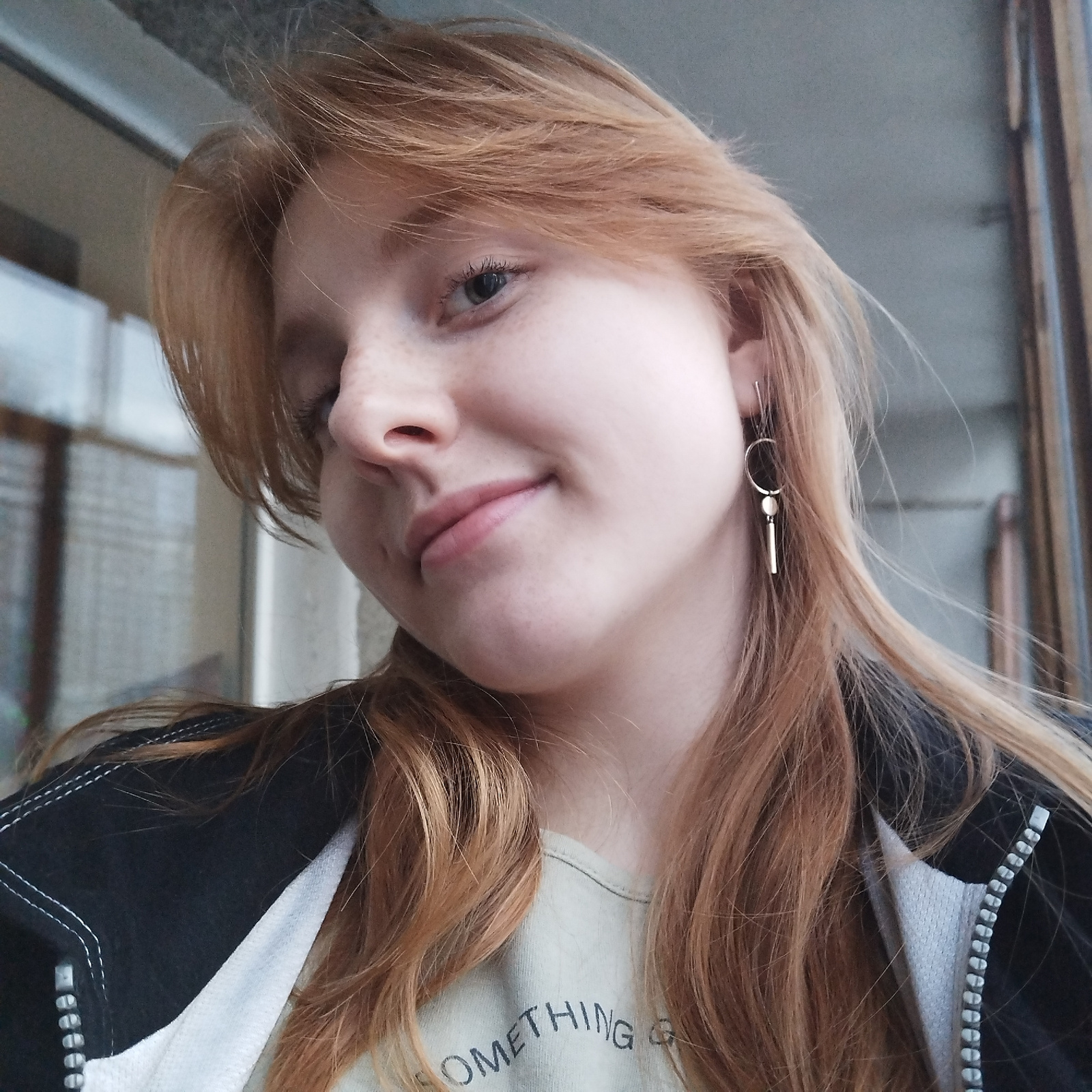 A young woman with red hair is posing for a selfie. She is wearing a black jacket with white trim and a light-colored t-shirt with a partial word visible, beginning with "SOMETHING". She has freckles…read more