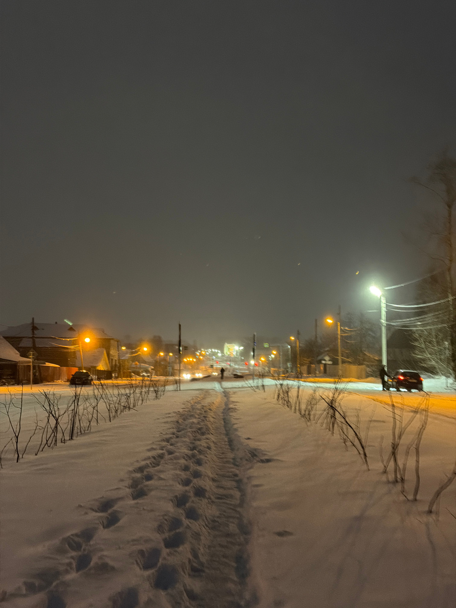 The image depicts a winter scene at night in what appears to be Berezniki, Russia, based on the street name and general location. The perspective is a ground-level, side view of a snow-covered pathway…read more