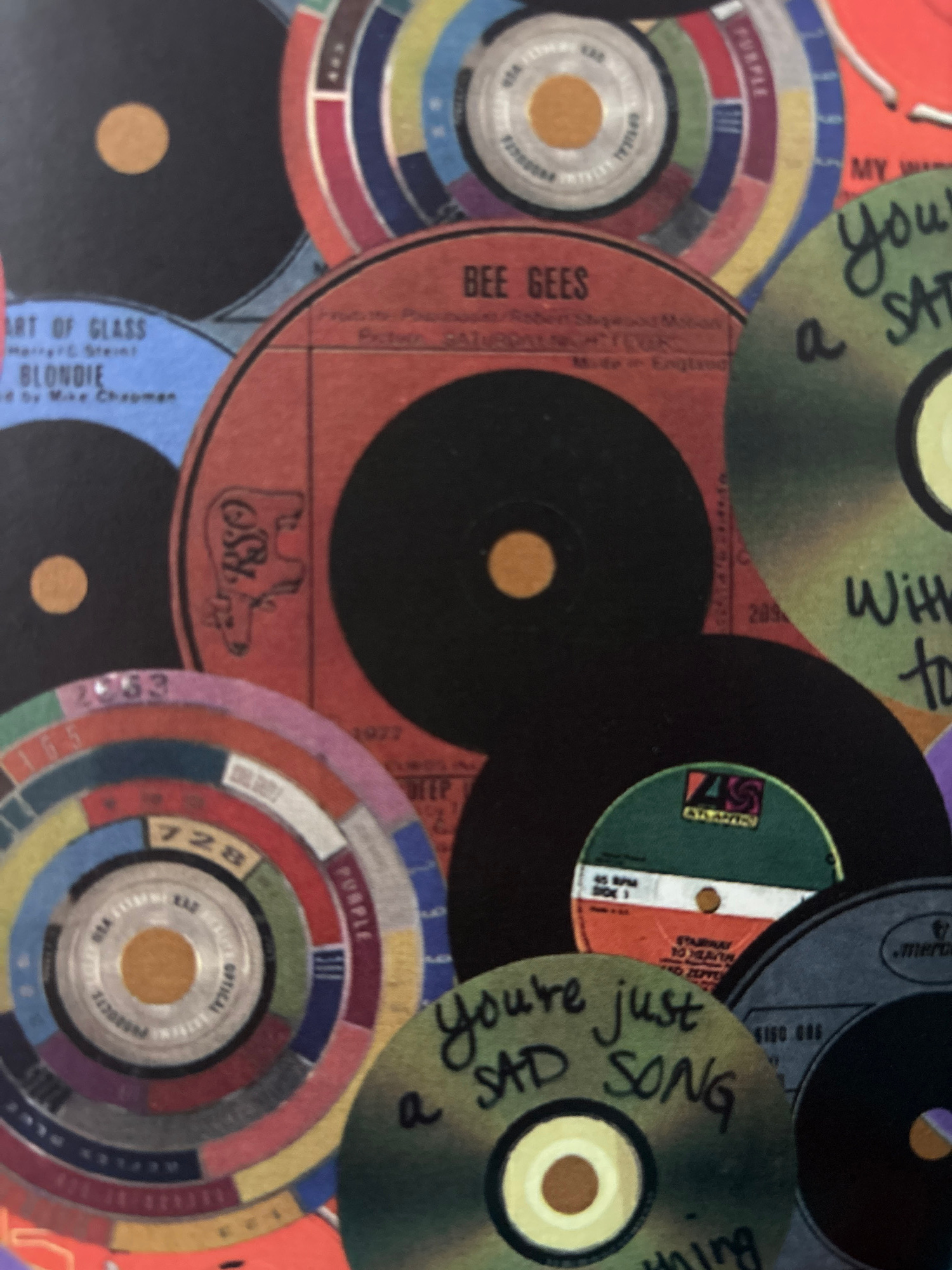 The image shows a collage of vinyl records and record labels. Some records have handwritten text on them. Brands and artists like "Blondie," "Bee Gees," and labels like "RSO" and "Atlantic" are visibl…read more
