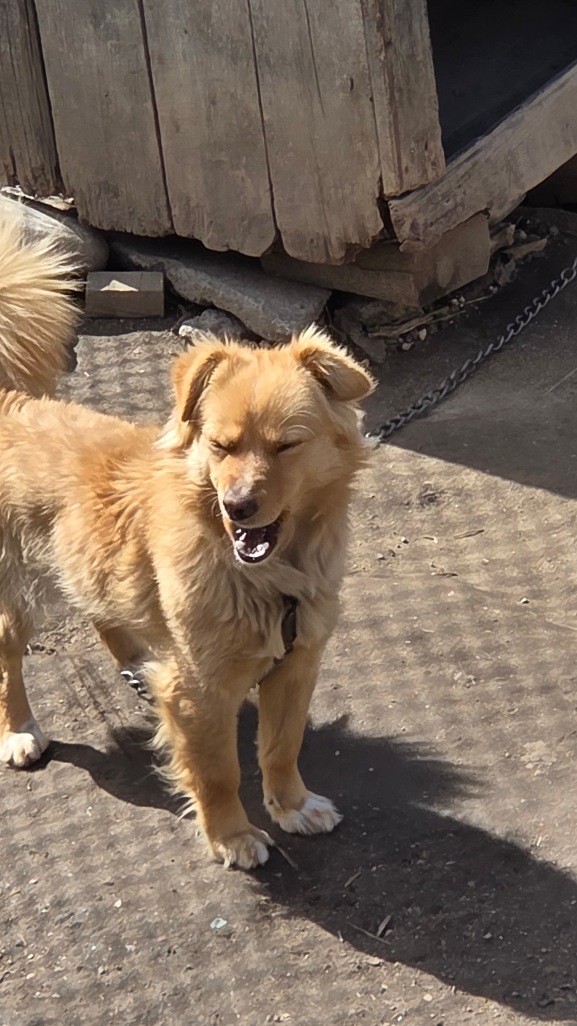 A golden-colored, medium-sized dog lies on its back in an outdoor area, seemingly in sunlight. The dog's head is tilted back, and its mouth is open. Next to the dog is a rustic wooden structure, possi…read more