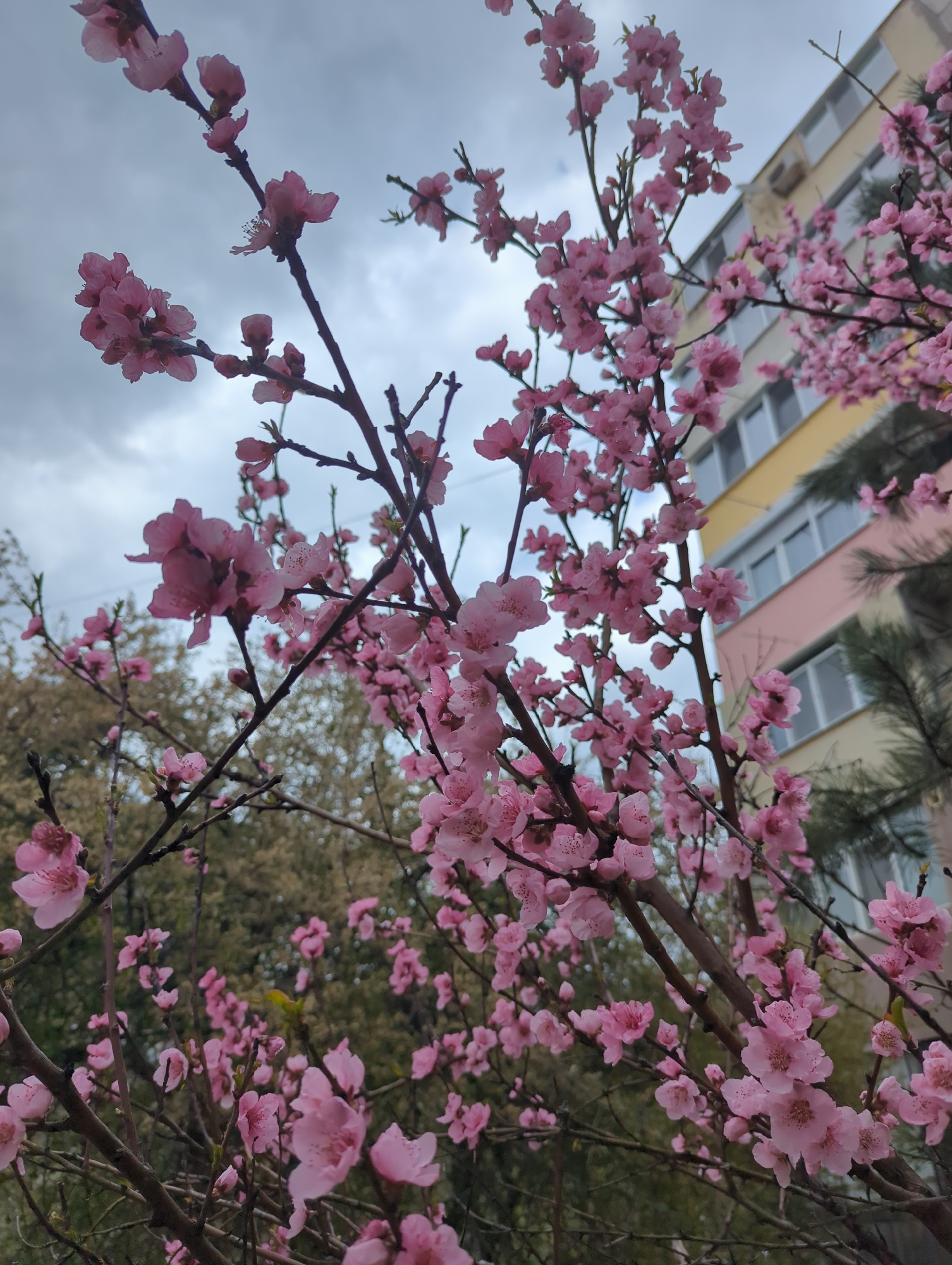 The image shows a close-up view of a blossoming tree with pink flowers. The tree branches fill the foreground. In the background, there is a blurred view of a building with pink and yellow walls and w…read more