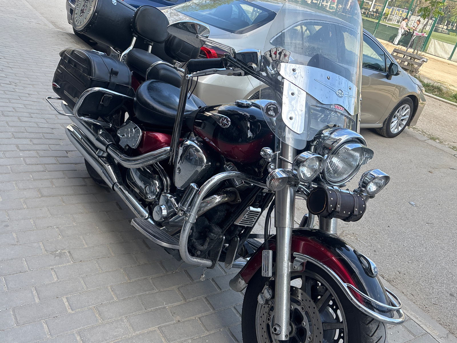 A large, classic-style cruiser motorcycle, featuring a striking red and black paint scheme and extensive chrome detailing, is prominently parked outdoors in Plovdiv, Bulgaria. The image, captured duri…read more