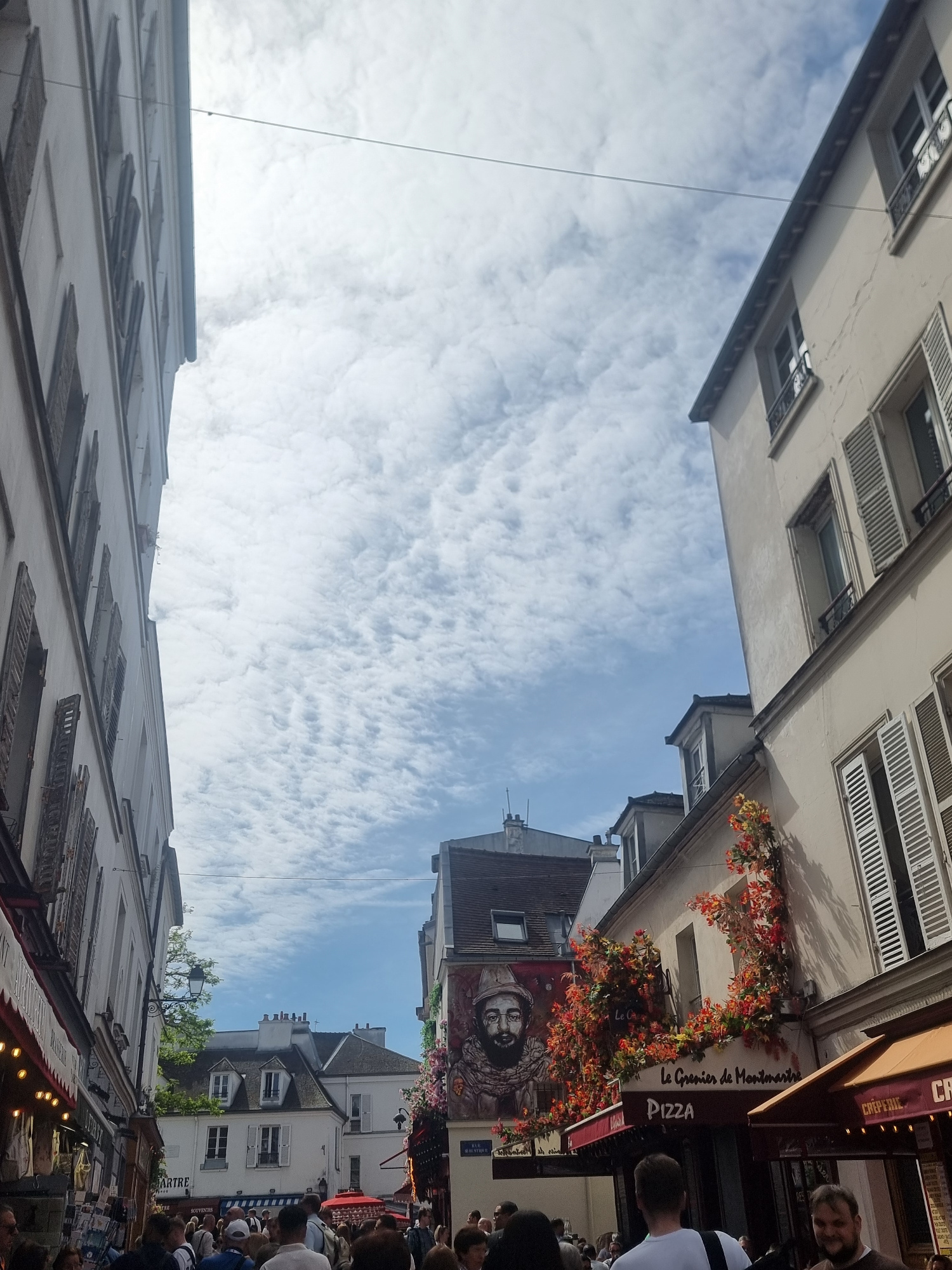 The image captures a vibrant street scene in what appears to be Montmartre, Paris, France, viewed from a low angle looking upwards. The original image is rotated 90 degrees clockwise. **Subjects:** T…read more