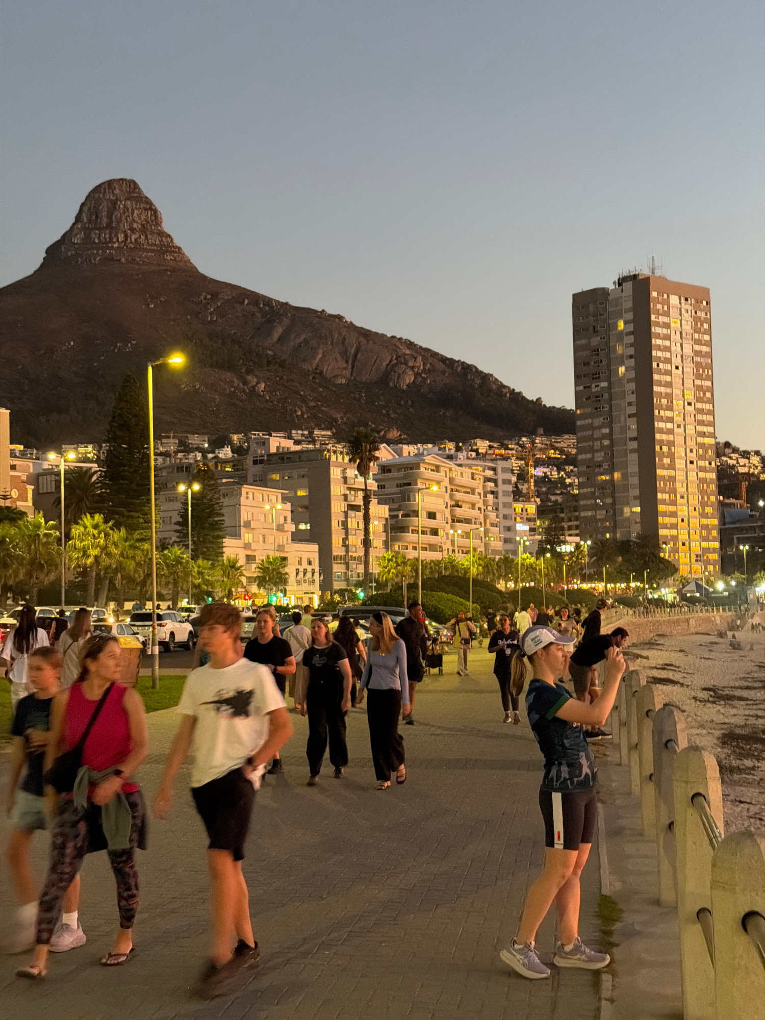 The image shows a street scene at night in Cape Town, South Africa. In the background is Lion's Head mountain and several buildings, including a tall apartment building. A crowd of people is walking o…read more