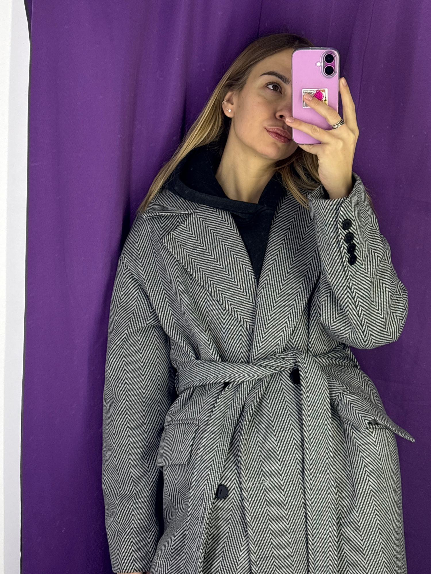 A woman lies on a purple surface, possibly a bed or a blanket, taking a selfie with a pink smartphone that partially covers her face. She is wearing a gray and white herringbone pattern coat. The bott…read more