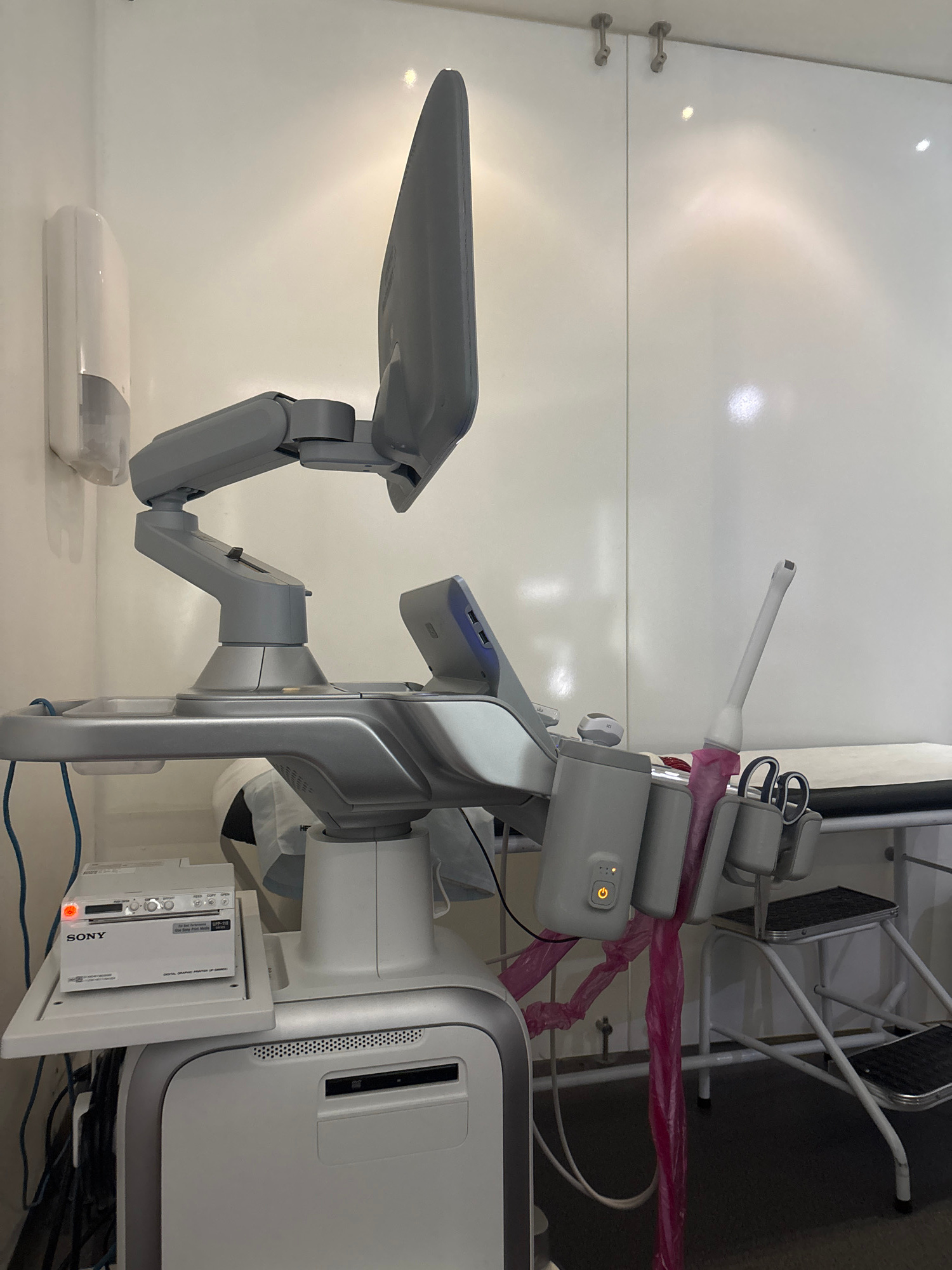 The image shows a medical ultrasound machine in a room. The machine is primarily white and gray, with an articulated arm holding a display screen. Several ultrasound probes are visible, attached to th…read more
