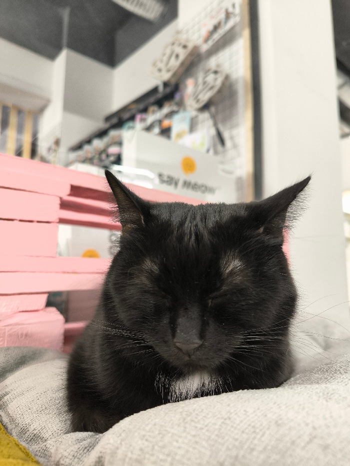 A black cat with closed eyes rests on a grey blanket. The cat has a small patch of white fur on its chest and long, white whiskers. In the background, a pink structure resembling stacked shelves is vi…read more