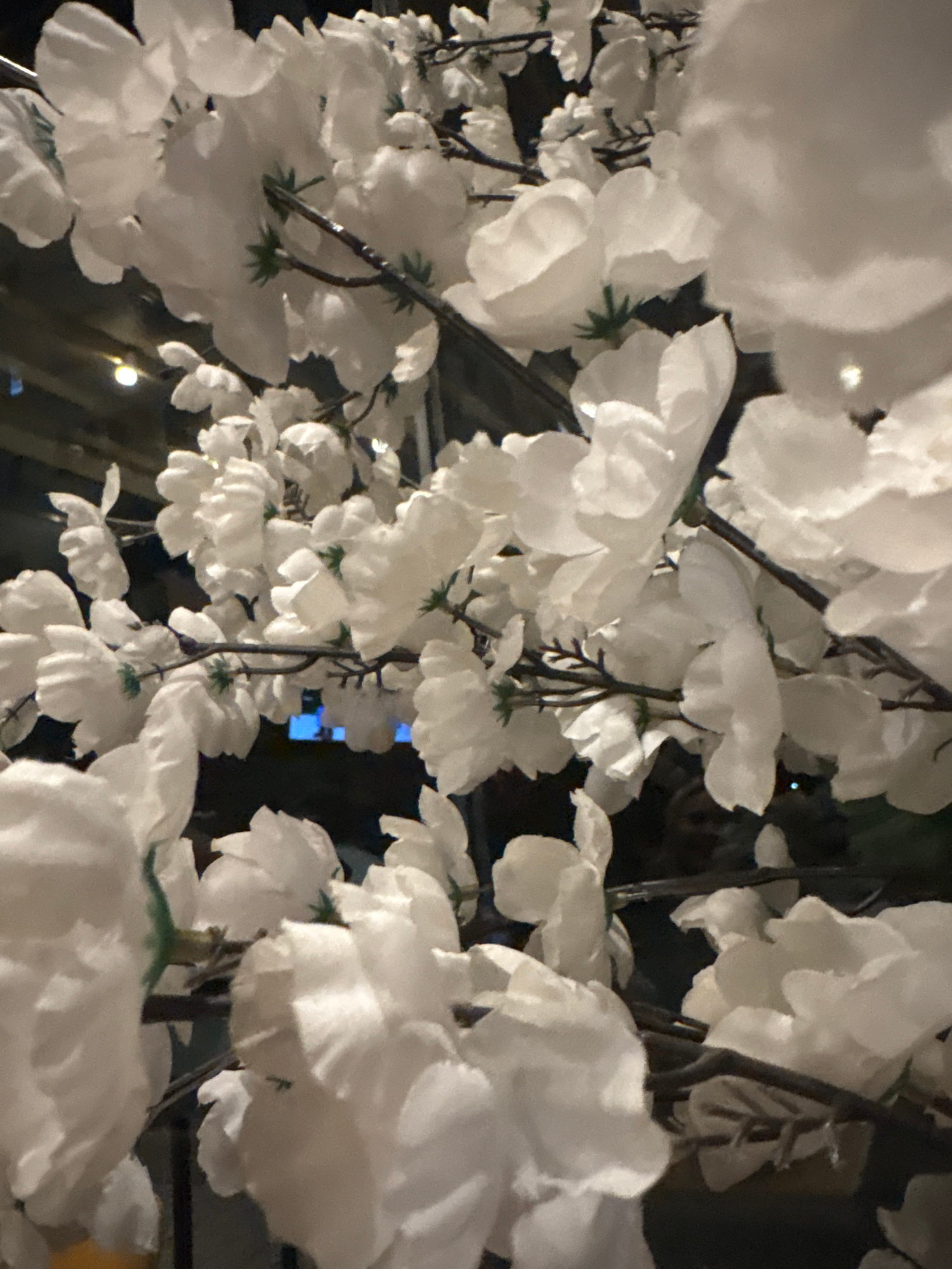 The image shows a close-up view of white artificial flowers hanging from a structure, likely a decorative installation. The background is dark, suggesting an indoor or nighttime setting. Some branches…read more