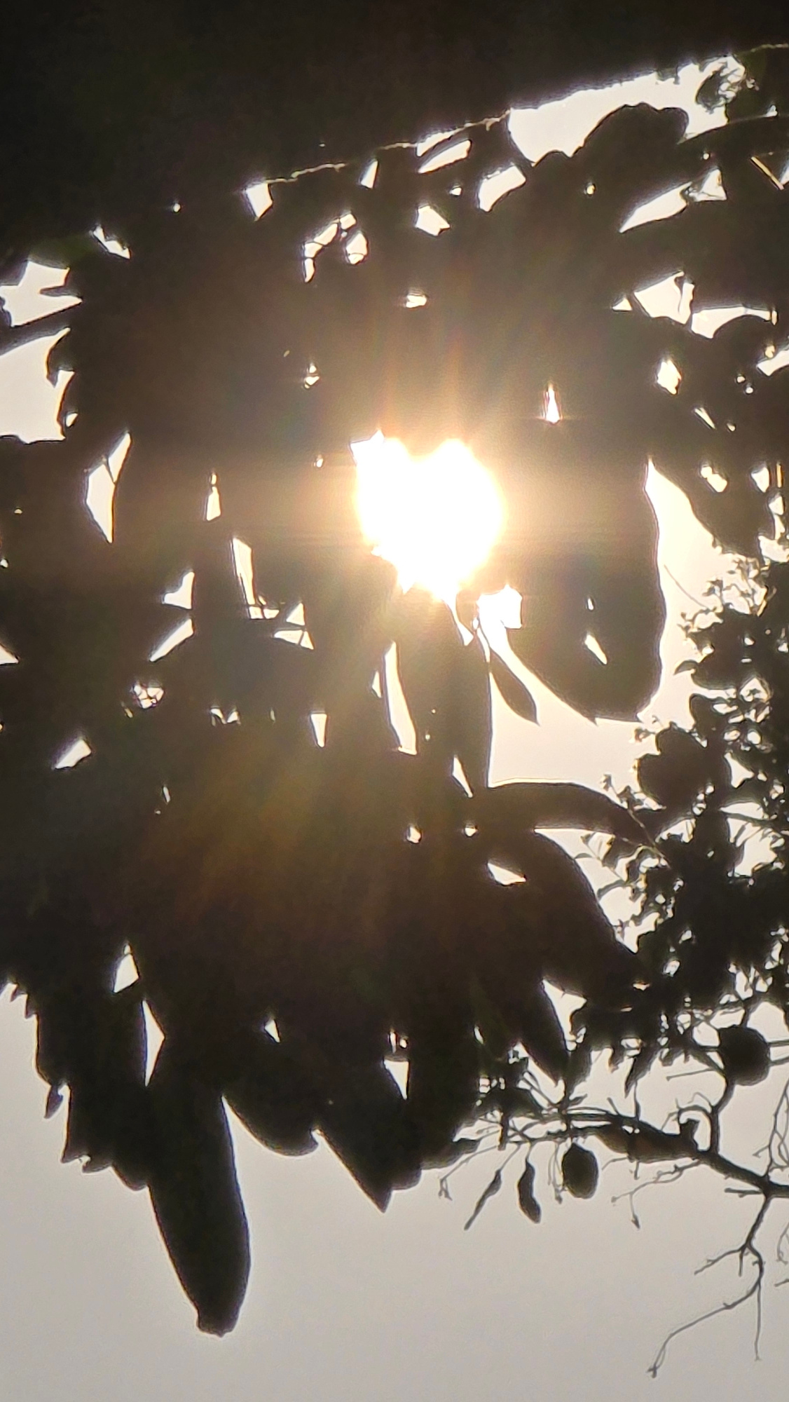 The image shows a silhouette of leaves and branches against a bright, hazy sky. The sun is visible through the foliage, creating a starburst effect. The specific plant species is difficult to identify…read more