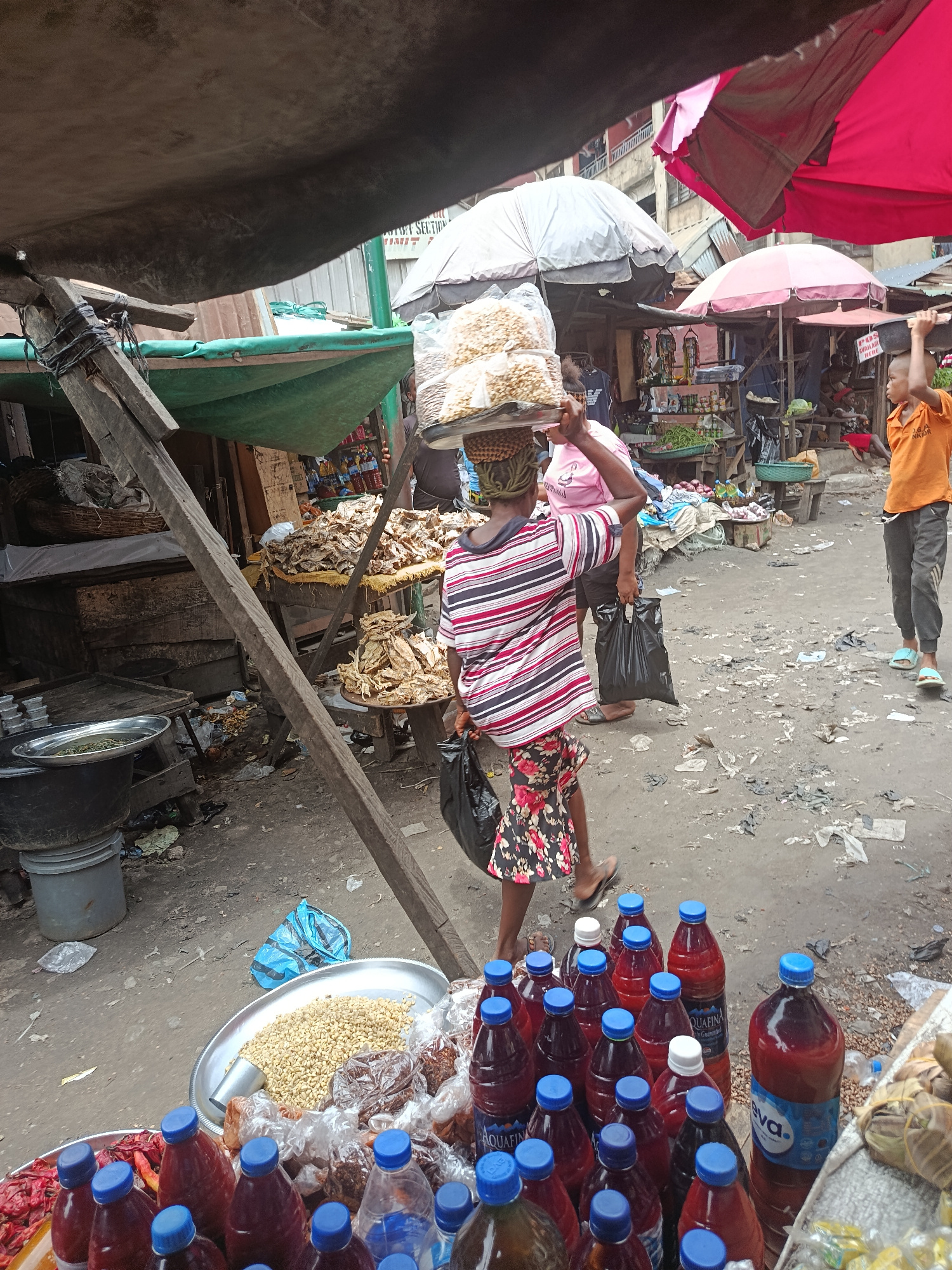 The image shows a busy outdoor marketplace in Nkpor, Nigeria. The ground is littered with trash. In the foreground, a tray is displayed with bottles of red liquid with blue caps, nuts, and bags of spi…read more