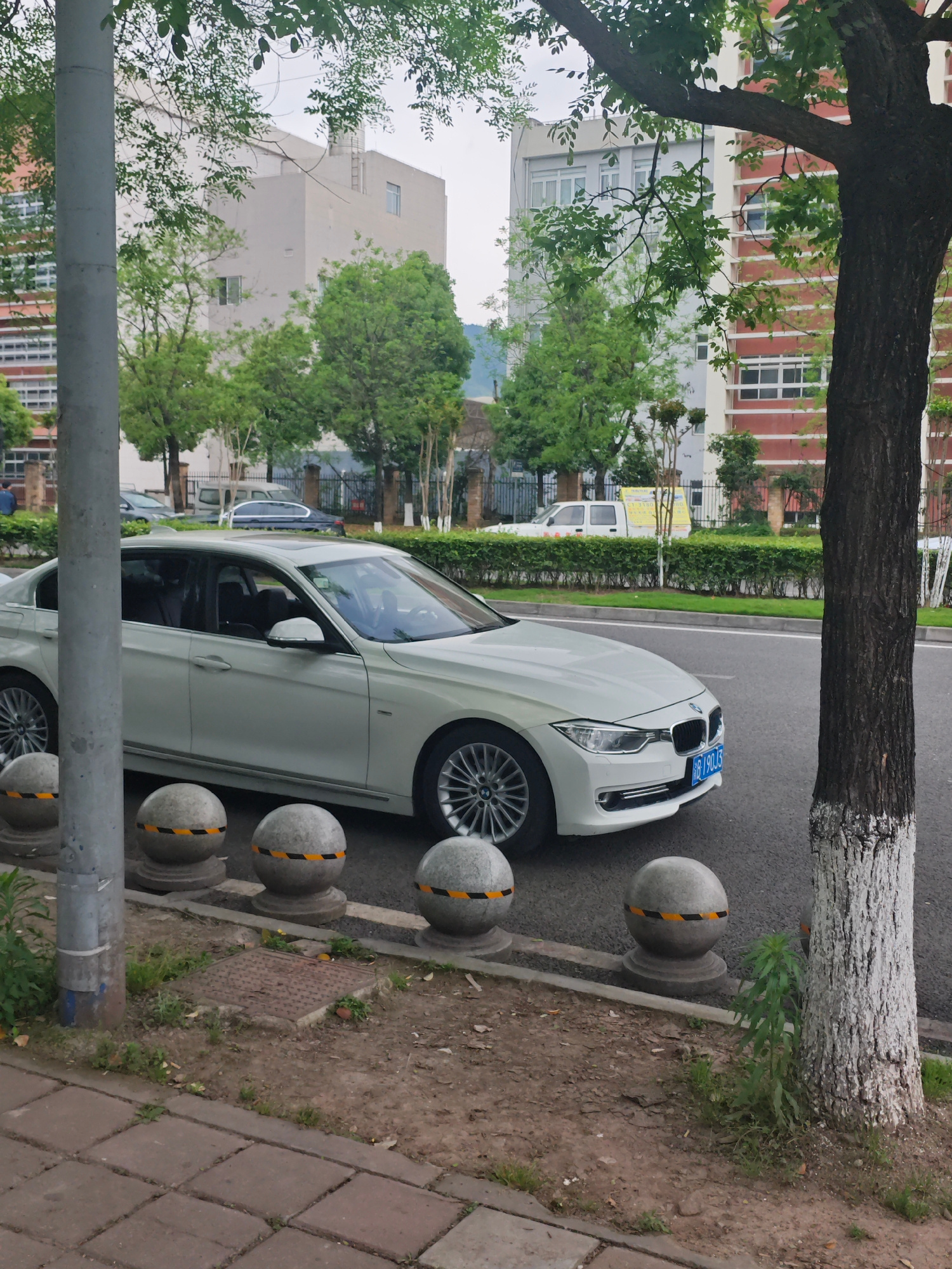 The image depicts a white BMW parked on the side of a road in an urban setting. A gray light post is on the left, and a tree with a whitewashed trunk is on the right, with green foliage in the backgro…read more