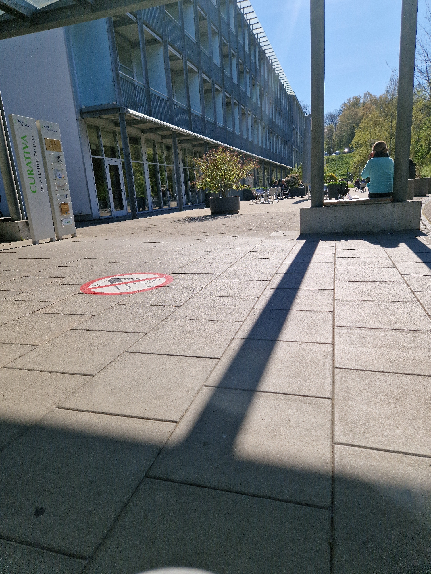 The image captures an outdoor scene at the Curativa Das Ambulante Zentrum in Rheinfelden, Switzerland. A gray, multi-storied building with numerous windows and balconies occupies the left side of the…read more