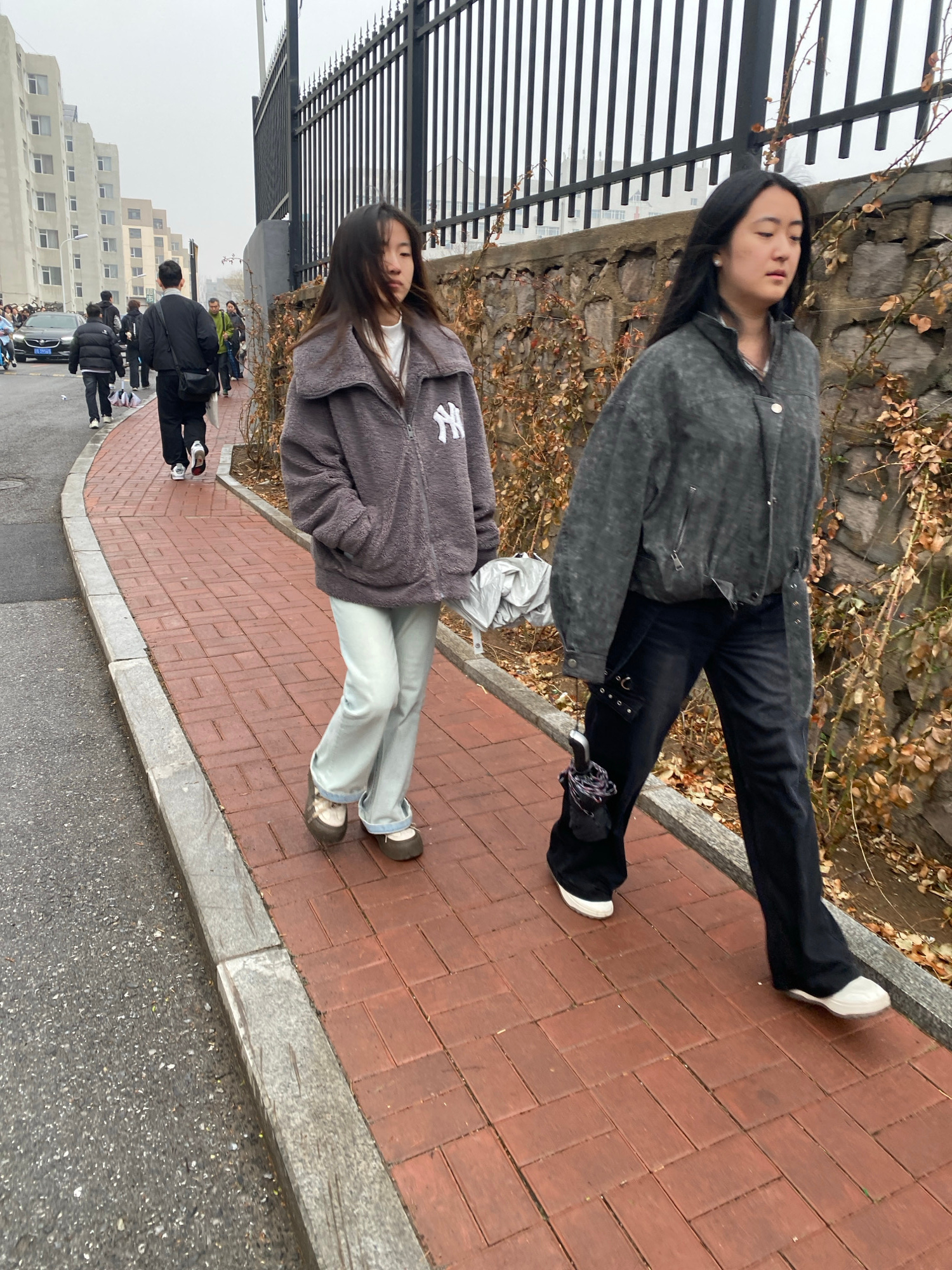Two women are standing on a brick sidewalk alongside a stone wall, partially obscured by leafless bushes and a black metal fence. The woman in the foreground is wearing a gray hoodie with a white logo…read more