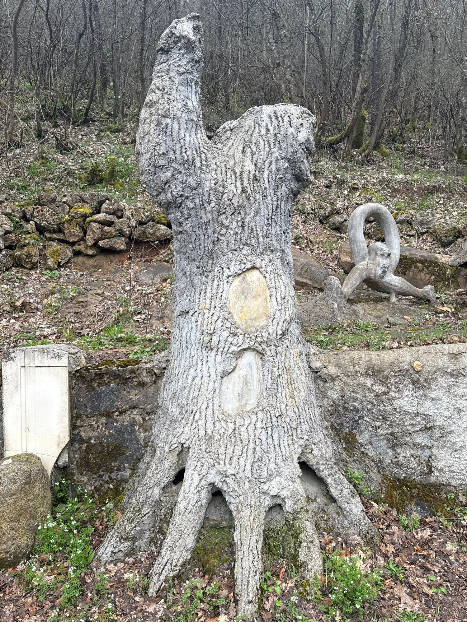 The image depicts a stone sculpture in Konche, Bulgaria. The sculpture is a stylized tree trunk with two inset, light-colored stones. It is oriented horizontally in the frame, appearing as though fallβ¦read more