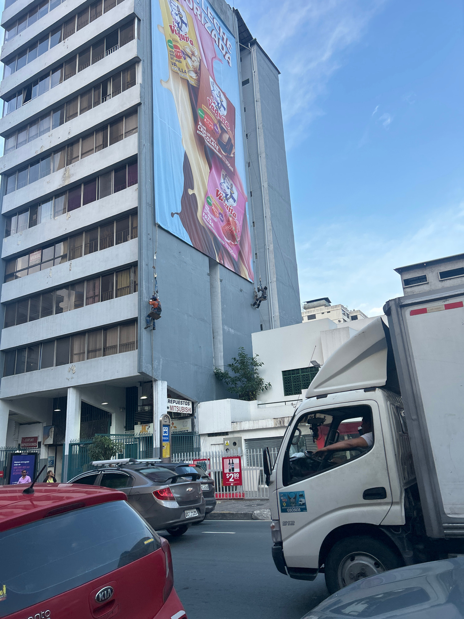 The image shows a building in Guayaquil, Ecuador, with two workers suspended and appearing to be installing or adjusting a large advertisement for "Vaquiita" brand flavored milk, specifically vanilla, chocolate, and strawberry flavors, in 200ml containers. The advertisement is prominently displayed on the building's facade. The building's exterior is characterized by a combination of grey and white tones with a linear, grid-like window design. Below, there's an entrance or parking area, with signs for "Repuestos Mitsubishi" (Mitsubishi spare parts) and a bus stop ("Parada"). Street-level details include parked cars (a red Kia, and a grey Chevrolet) and a delivery truck bearing the license plate GSO5035, indicating ongoing street activity. Street signs and other commercial establishments contribute to the urban setting. The sky is clear with a slight haze or light cloud cover. | Open Wire