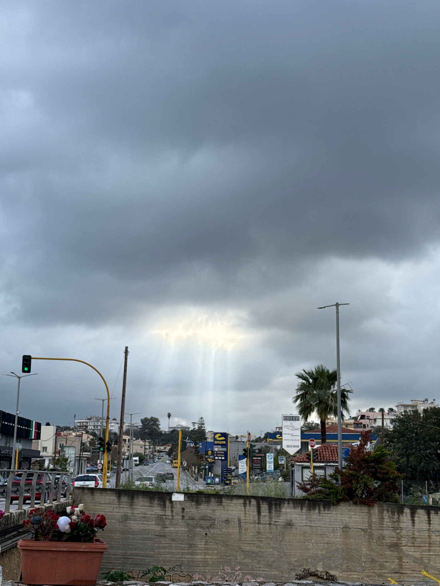 The image depicts a street view in Chania, Greece, under an overcast sky with a break allowing sunlight to stream through the clouds. A palm tree stands to the right of the frame. Streetlights are visβ¦read more