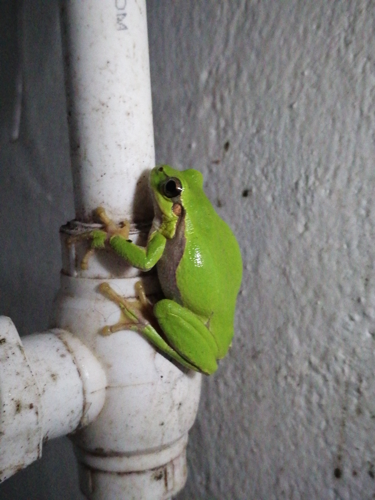 A bright, vivid green frog, likely a tree frog, is the central subject of this close-up image. It is perched on a section of white PVC piping, specifically at an elbow joint where a vertical pipe conn…read more
