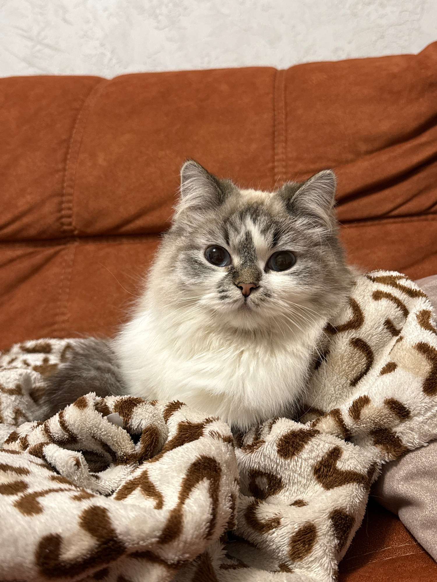 A cat is partially wrapped in a tan and brown patterned fleece blanket and sitting on a brown couch. The cat has light grey and white fur with dark grey eyes. The blanket has a swirling pattern with d…read more