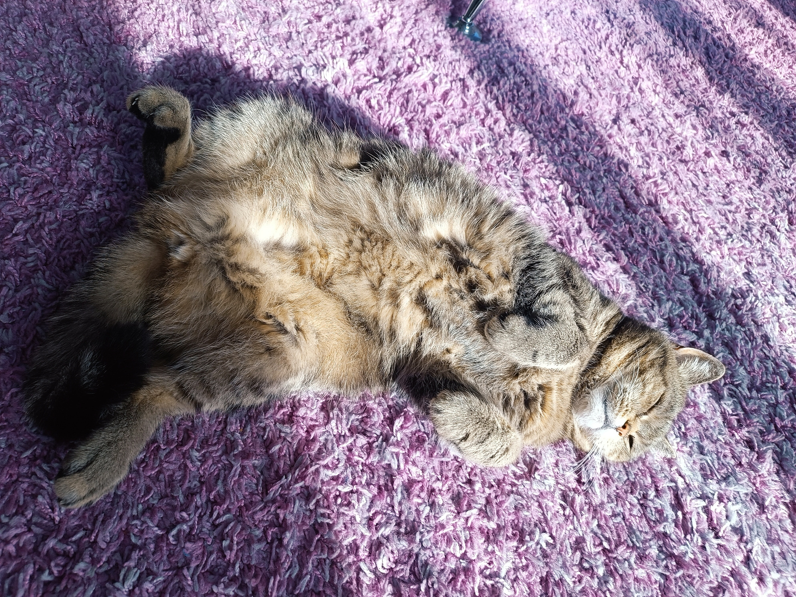 A tabby cat is lying on its back on a purple shag rug. The cat is positioned diagonally across the frame. The rug appears to be indoors with sunlight streaming in, creating shadows. The cat's belly is…read more