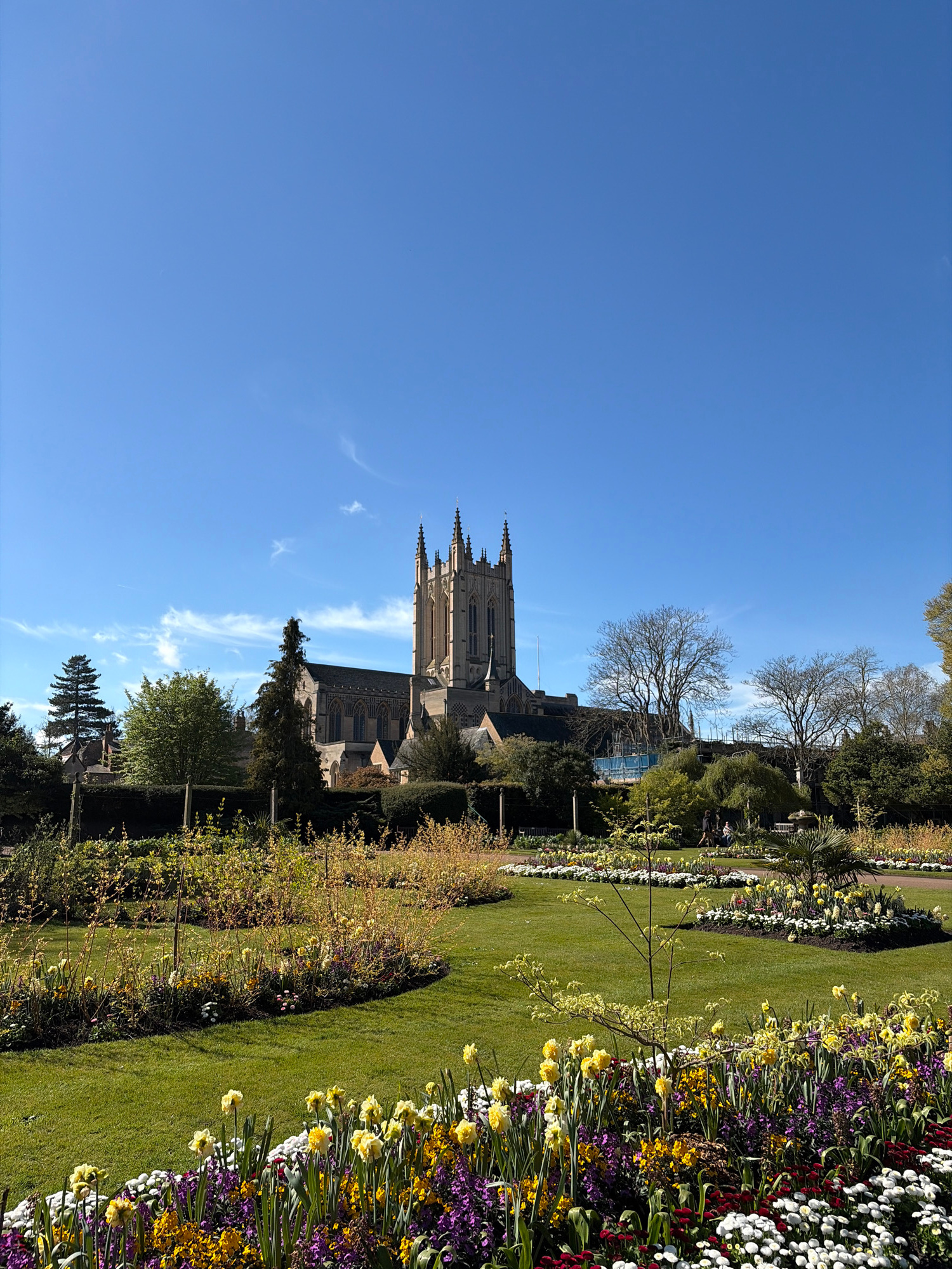 The image shows a landscape in West Suffolk, United Kingdom. A large, gothic-style cathedral occupies the center of the frame, partly obscured by trees. A manicured lawn stretches to the right, border…read more