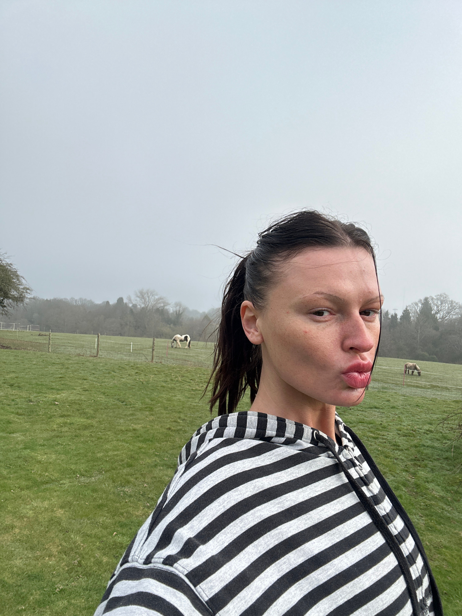 An outdoor portrait depicts a female subject in a rural setting. She is positioned slightly right of center, looking directly at the camera with her lips pursed. Her dark hair is pulled back, with wet…read more