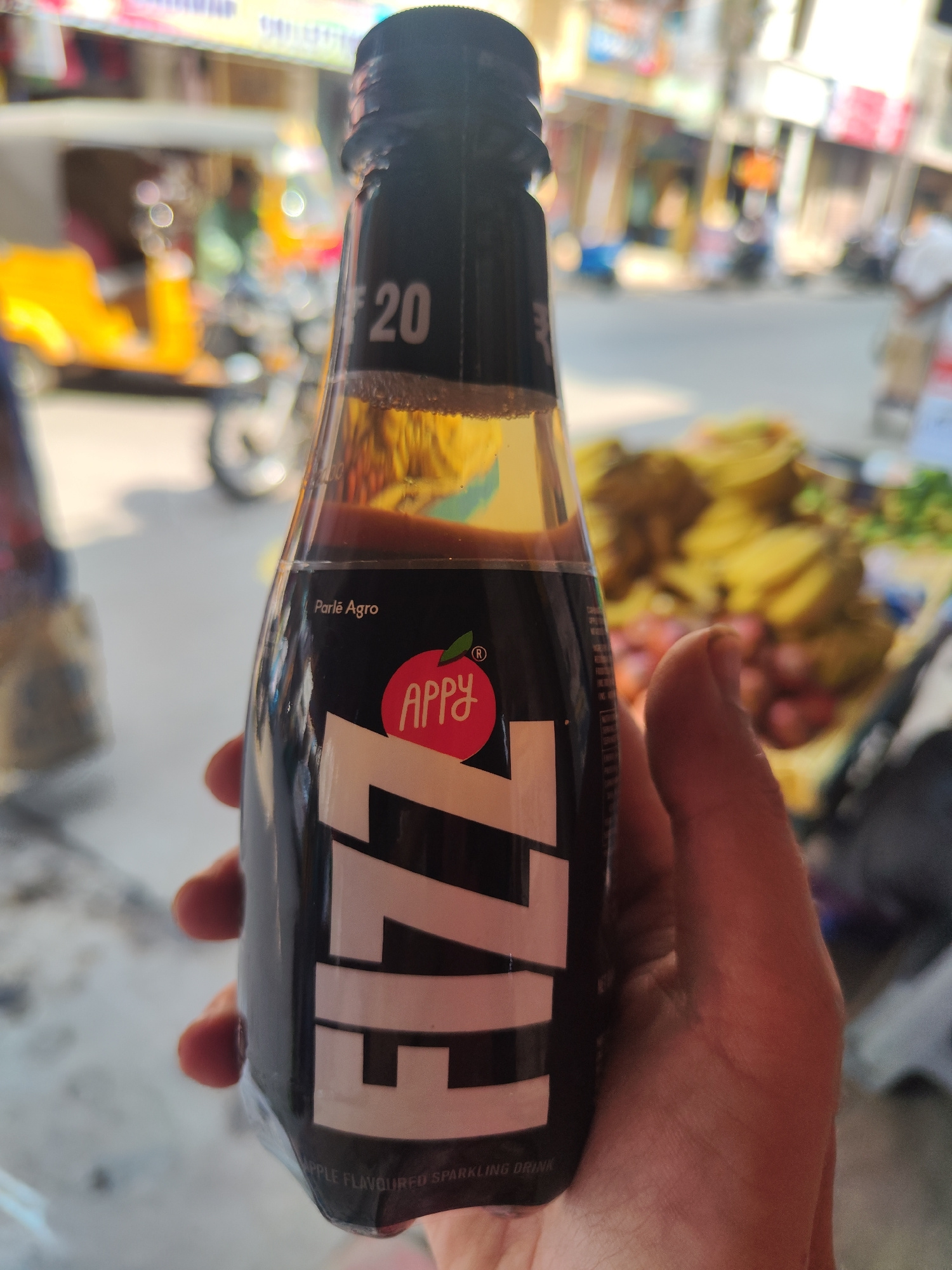 A hand holds a glass bottle of Appy Fizz against the backdrop of a blurry street scene in Puttaparthi, India. The bottle is primarily black with "FIZZ" in bold white letters and a red apple logo with…read more