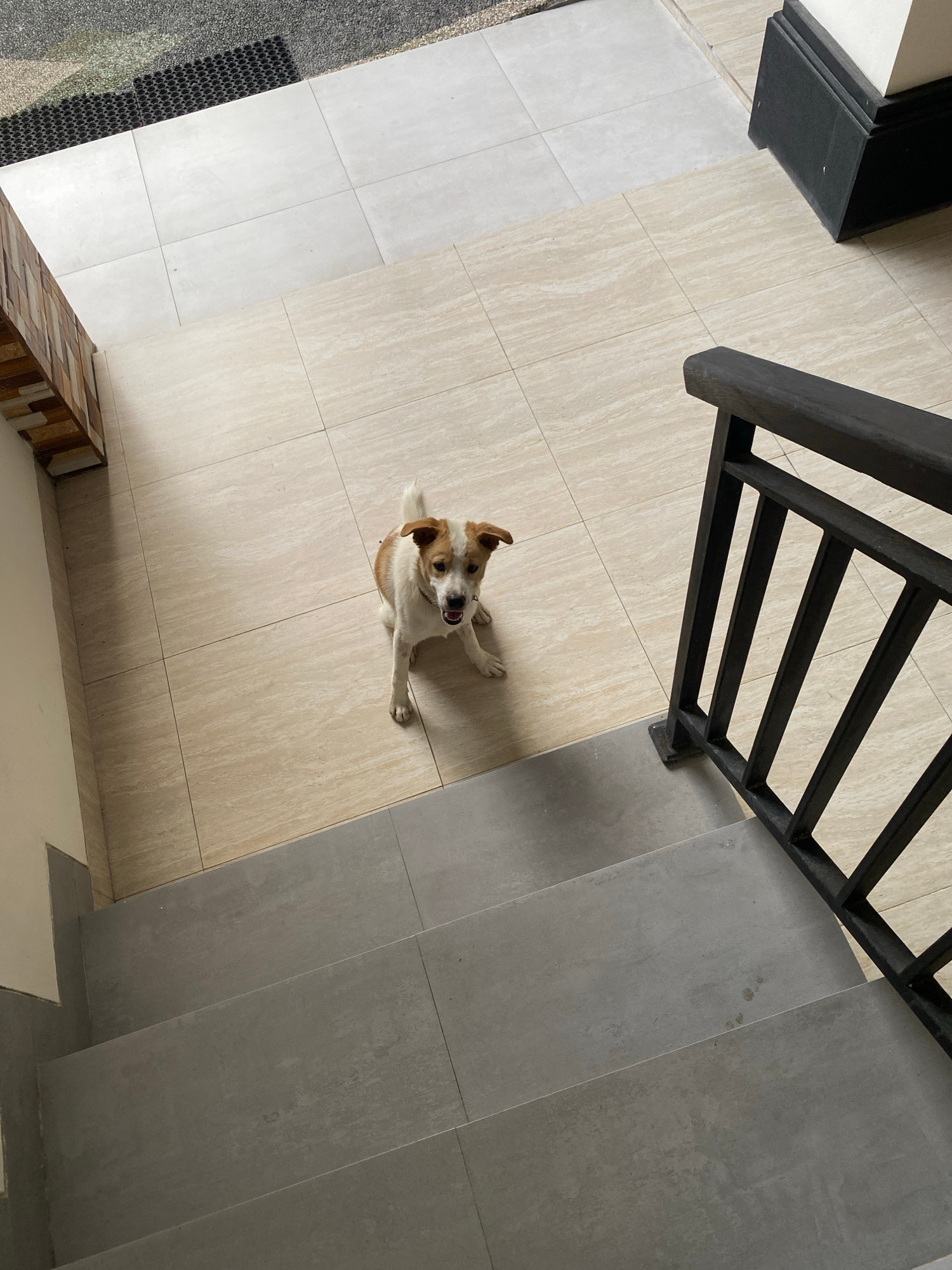 The scene appears to be an interior space, likely a landing or entryway in a residence located in Nusa Dua, Indonesia. The floor is tiled with two different types of tiles - a beige tile and a grey tiβ¦read more