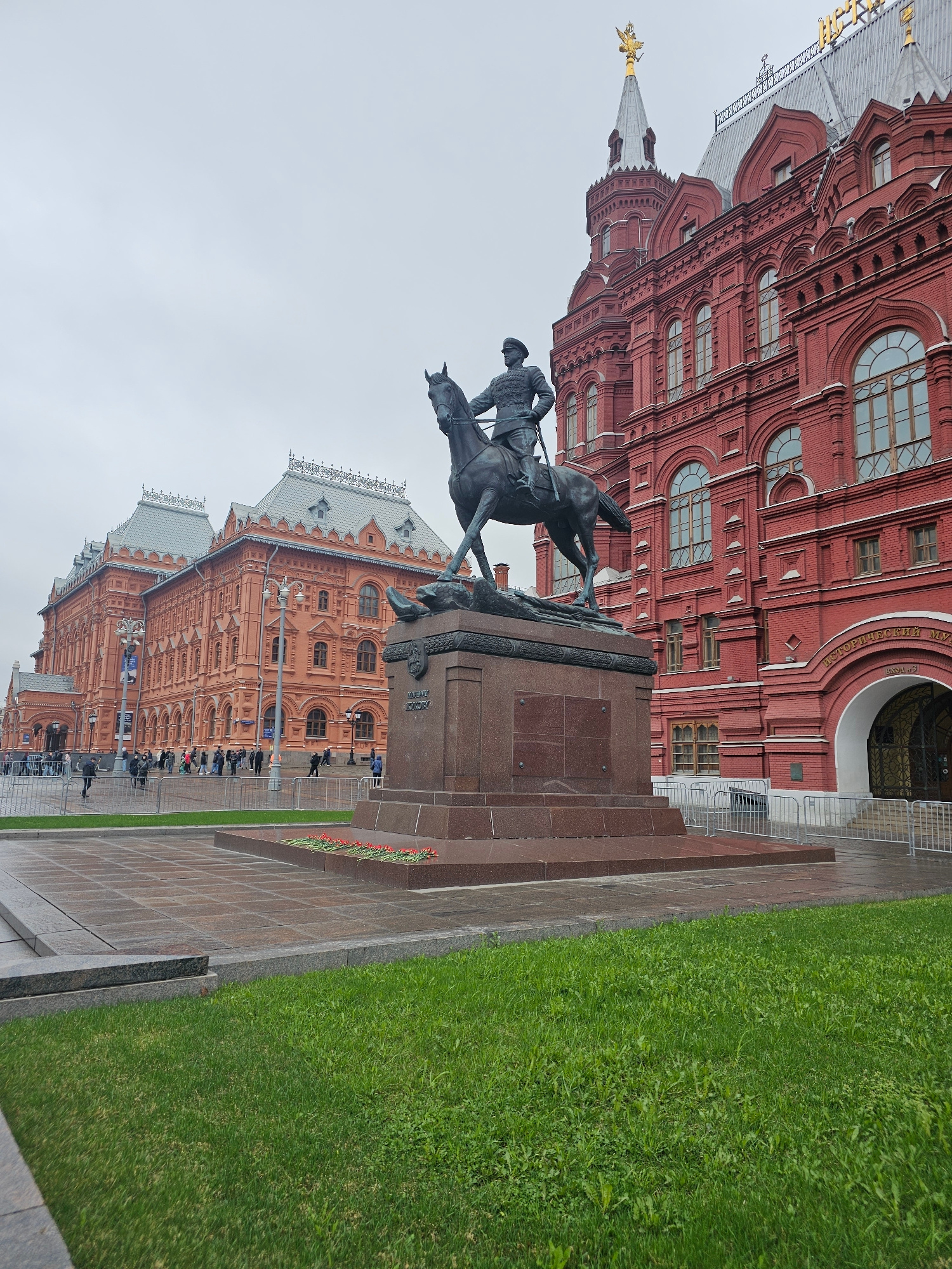 The image shows a statue of Kuzma Minin and Dmitry Pozharsky in front of the State Historical Museum on Red Square in Moscow, Russia. The statue is a bronze sculpture of the two figures on horseback,…read more