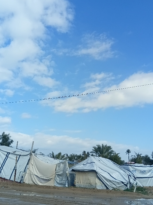 A row of tents stands alongside a muddy path under a partly cloudy sky. The tents, possibly a refugee or migrant camp, are white with some marked by the "IOM" logo. Palm trees punctuate the backgroundβ¦read more