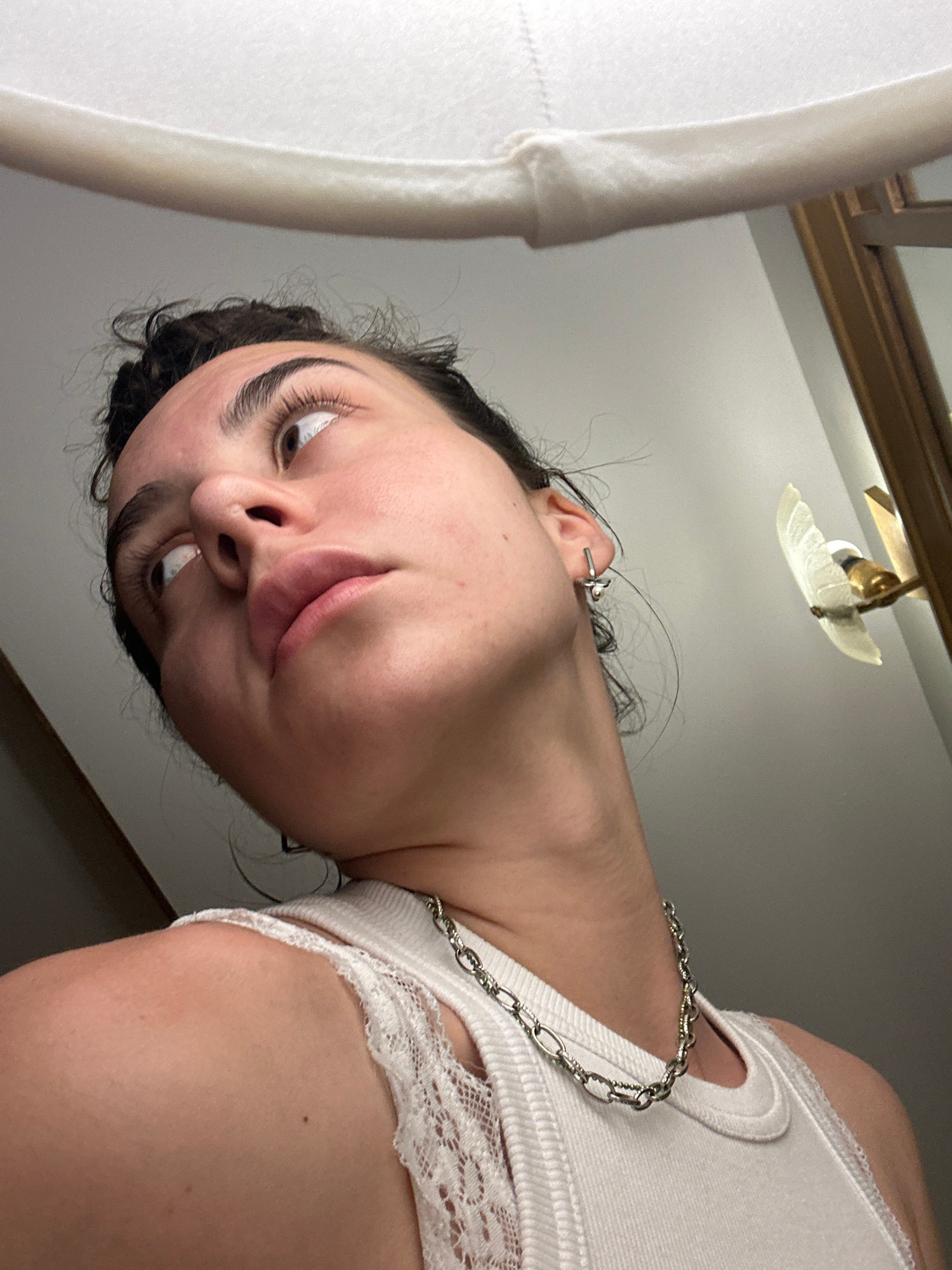 A close-up, slightly angled, indoor photograph shows a woman wearing a white tank top with a lace trim and a silver chain necklace. She is looking towards the right side of the frame with an expressio…read more