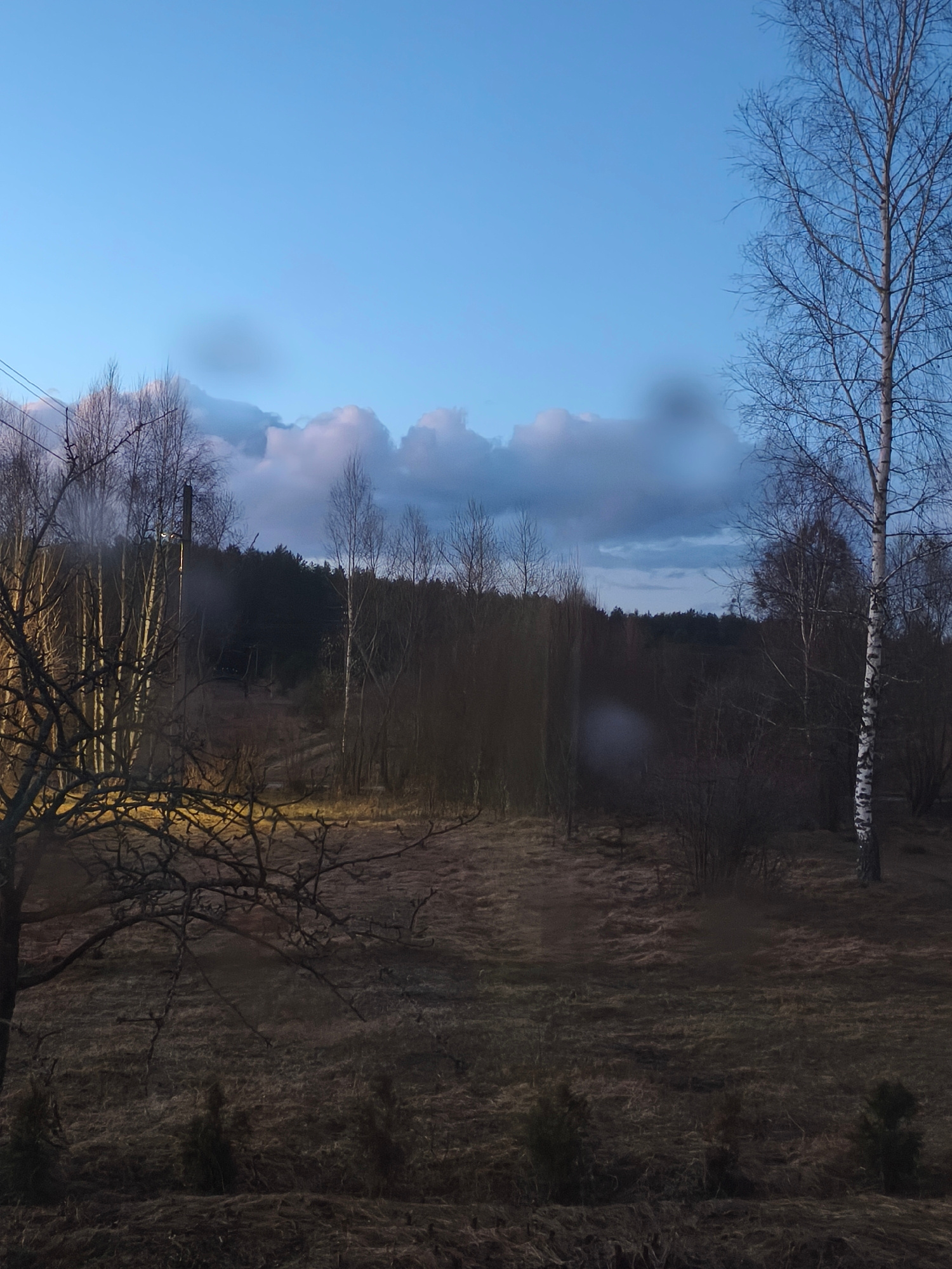 The image depicts a landscape viewed from an interior location, possibly through a window, given the blurry patches that might be moisture on the glass. The foreground is dominated by a field of dry,…read more