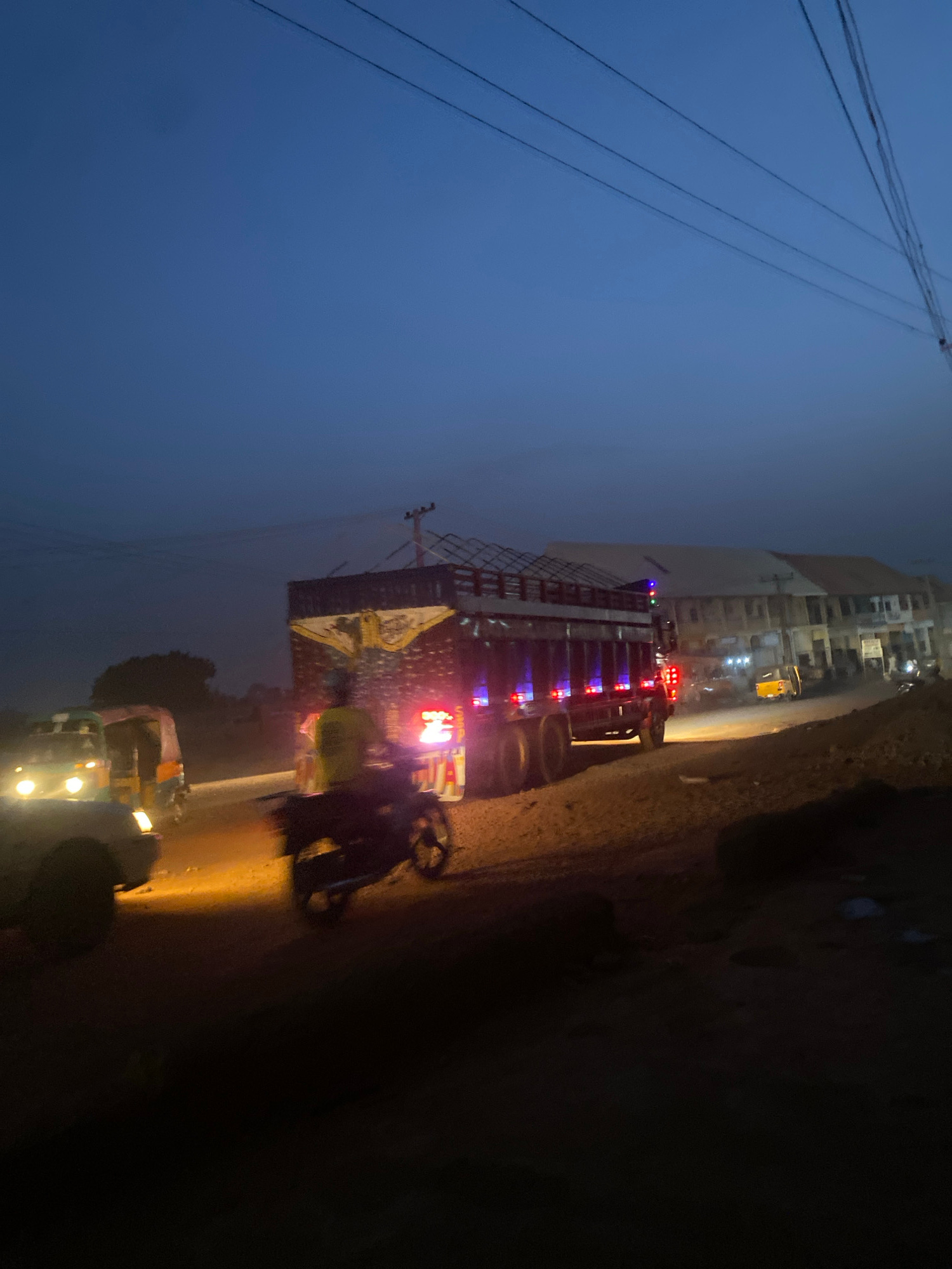 The image depicts a street scene at dusk or night in Tudun Wada, Nigeria. A large truck with multi-colored lights and possibly an overloaded cargo is parked along the side of the road. A motorcycle an…read more