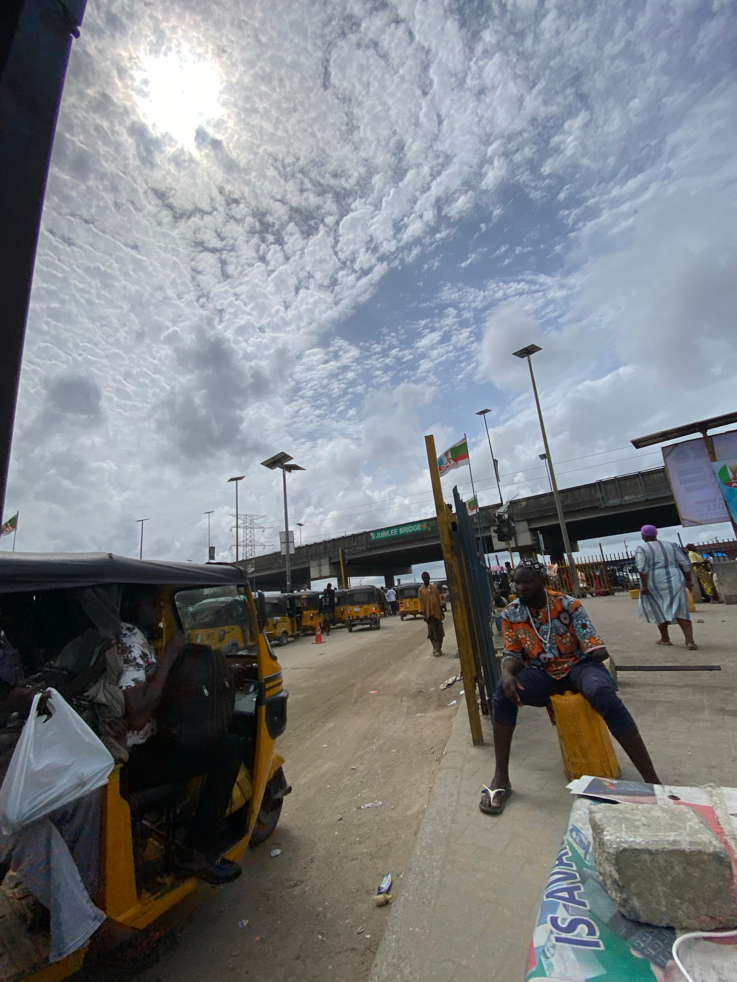 The image shows a street scene in Lekki, Nigeria, near Jubilee Bridge. The sky is cloudy. In the foreground is a yellow tricycle (keke) with a white plastic bag inside, along with other items. Several…read more