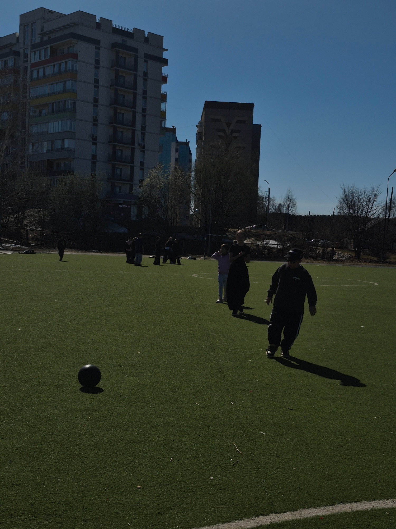 The image shows an outdoor scene in the city of Chaikovsky, Russia, during daylight. The location appears to be an artificial turf sports field, likely for soccer or football. On the left, several apa…read more