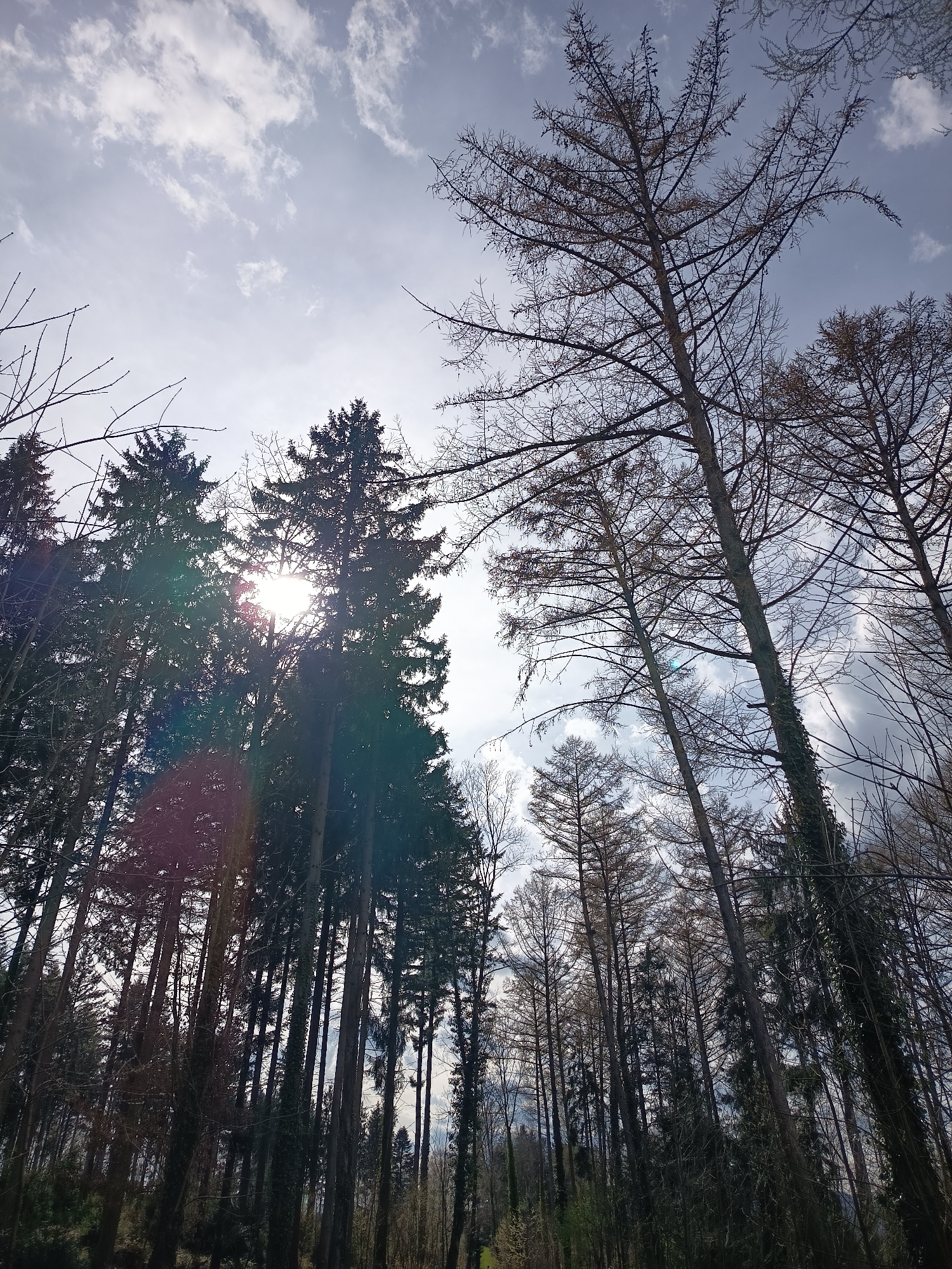 The image shows a view looking up through a forest in Neuendorf, Switzerland. Predominantly evergreen trees, interspersed with deciduous trees in their leafless state, are seen against a sky with scat…read more