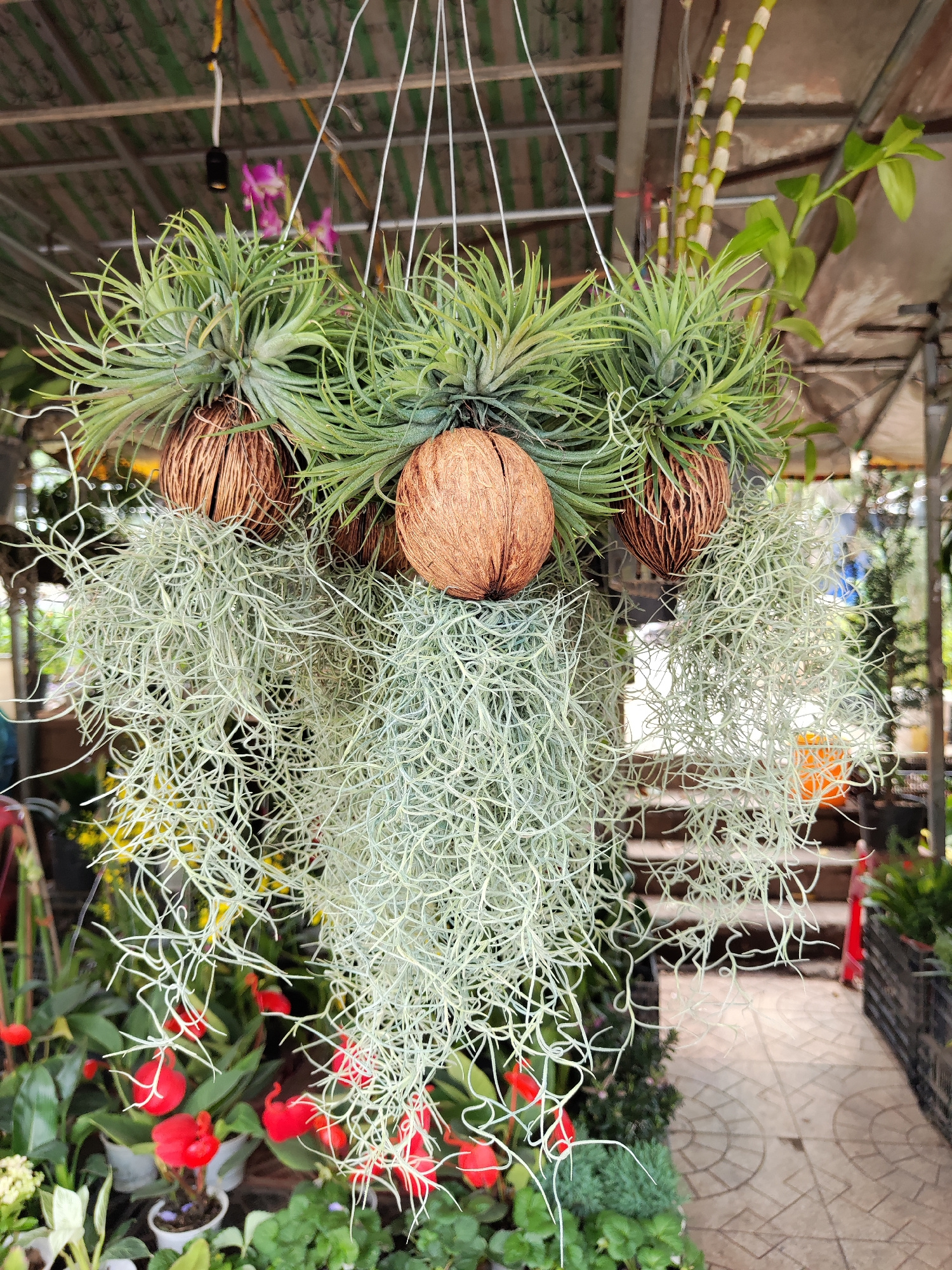The image depicts a hanging plant arrangement consisting of Tillandsia plants and Spanish moss (Tillandsia usneoides) suspended by wires. The plants are mounted in what appear to be dried fruit or nut…read more